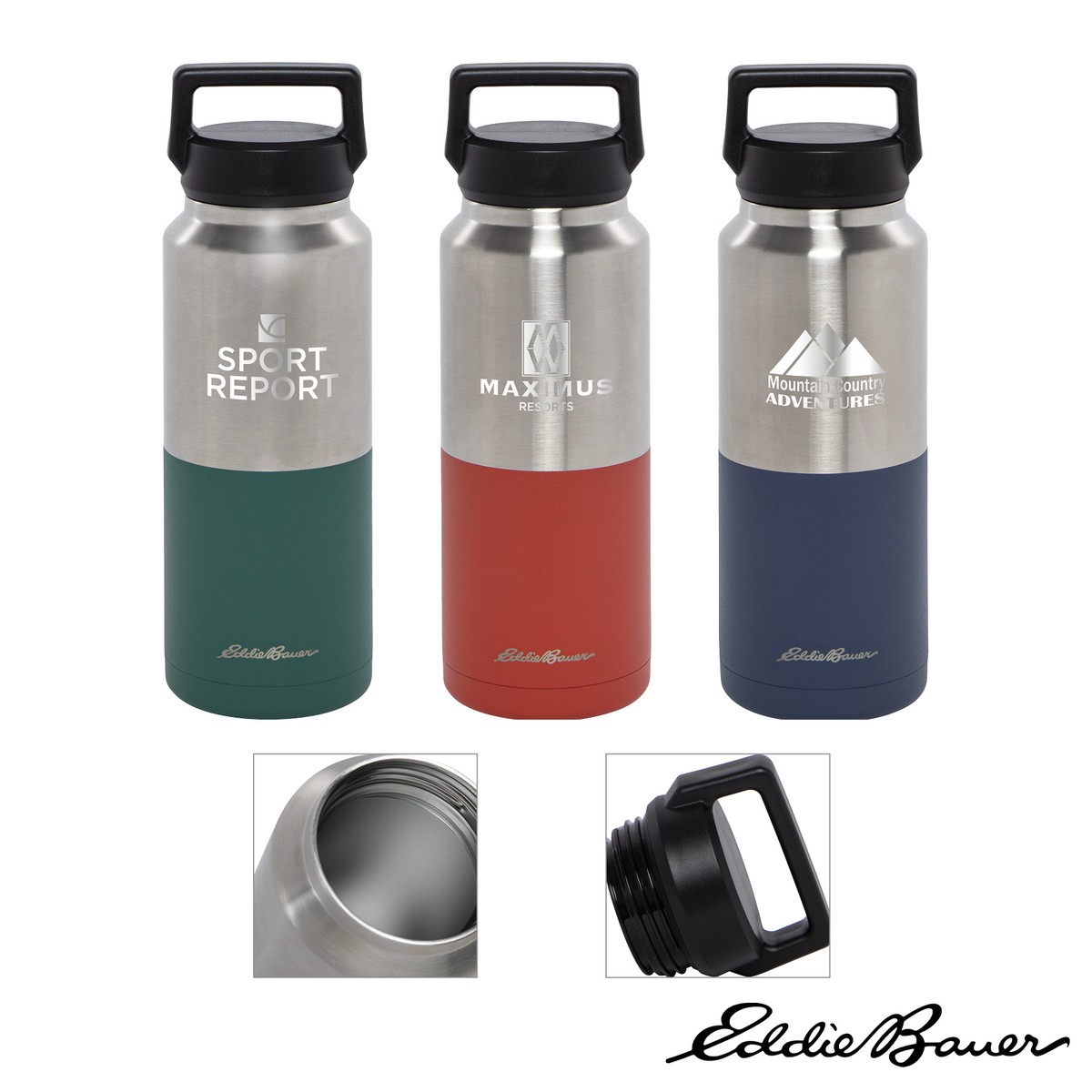 Stay hydrated with the 33 oz. Eddie Bauer Mesa 2-Tone Bottle and surely it will become your perfect adventure companion 365 days a year! The bottle has a unique two-tone finish with brushed steel on its upper body and a durable powder coat finish on the bottom half. Its double wall vacuum sealed construction helps keep your hot drink hot for 12 hours and cold drink cold for 24 hours. The leak-proof screw top lid with integrated carry handle is easy to drink from and to travel with. FDA compliant and BPA Free. Complies with Prop 65. 3 3/4" W x 11 3/8" H x 3 3/4" D