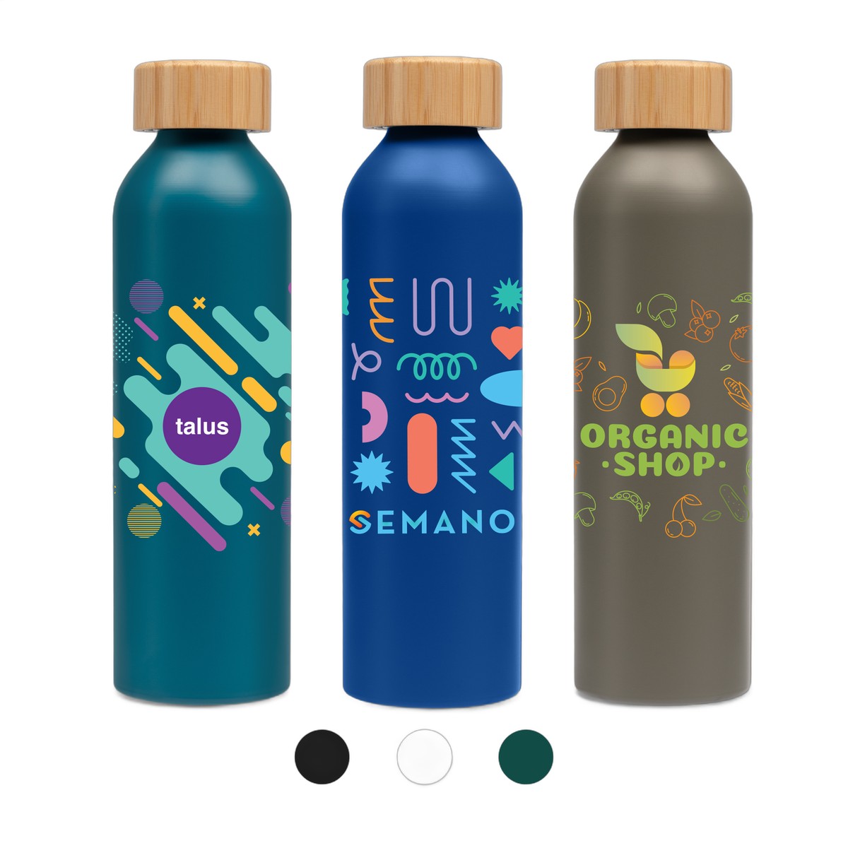 Our Eden 22-ounce Aluminum Water Bottle with Bamboo Lid is perfect for clients seeking to promote a sustainable presence. The single wall, aluminum Bottle features a screw-on, bamboo leakproof lid and a matte finish that offers a beautiful background to companies promoting their brand messages, logo, and more. . Complies with Prop 65. 8.86" H x 2.60" W