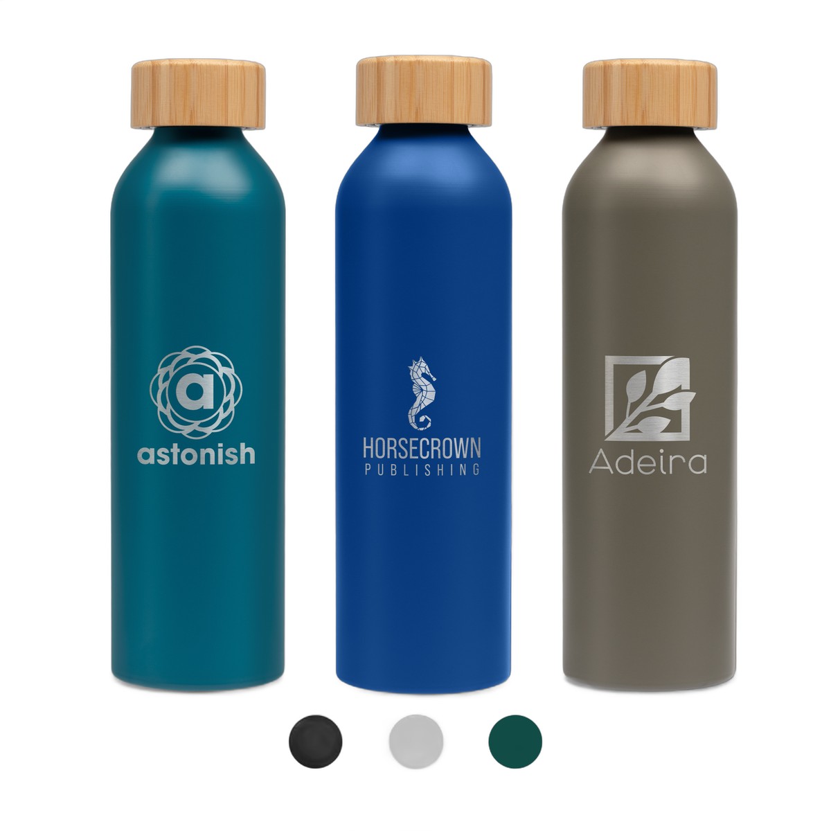 Our Eden 22-ounce Aluminum Water Bottle with Bamboo Lid is perfect for clients seeking to promote a sustainable presence. The single wall, aluminum Bottle features a screw-on, bamboo leakproof lid and a matte finish that offers a beautiful background to companies promoting their brand messages, logo, and more. . Complies with Prop 65. 8.86" H x 2.60" W