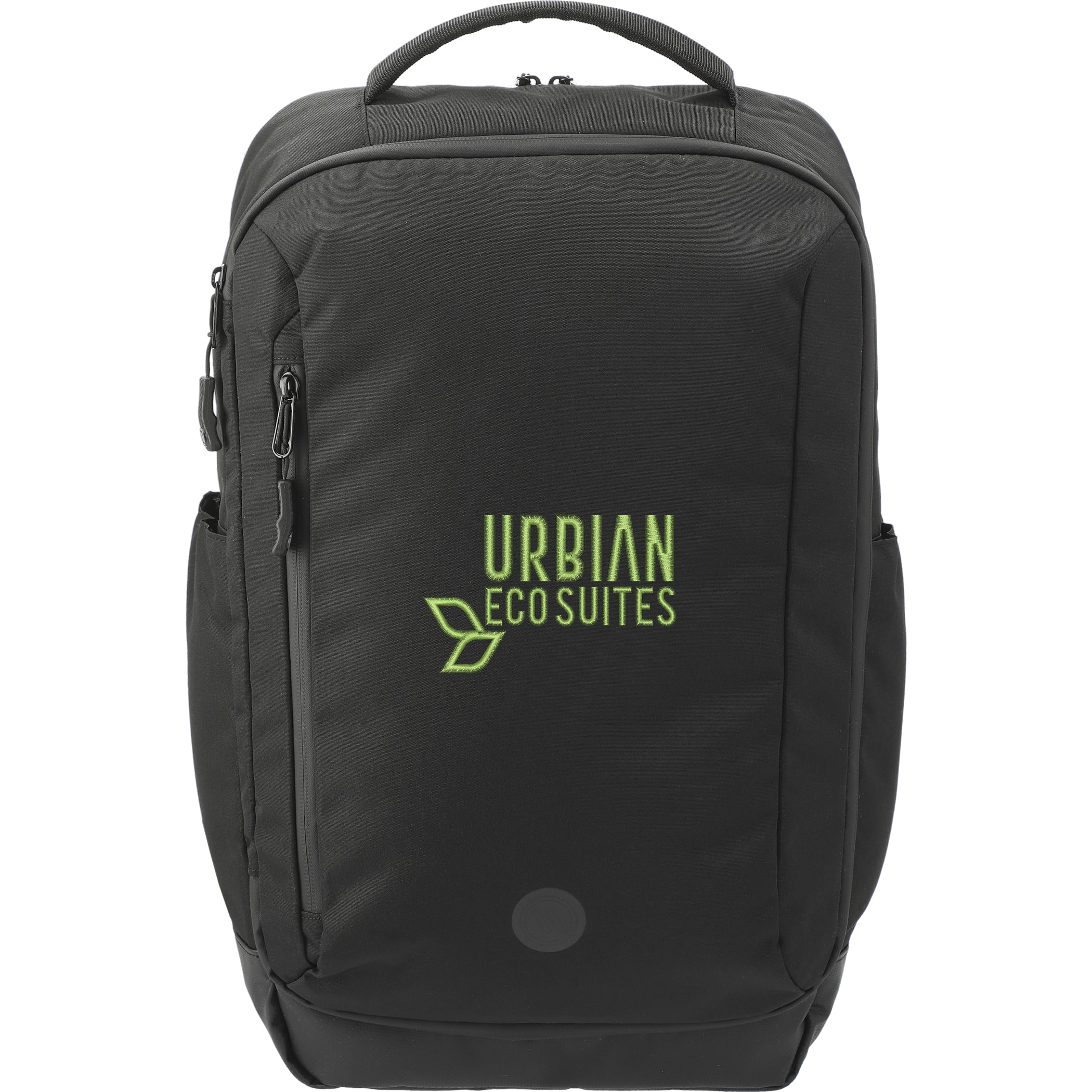 The elleven™ Versa 15'' Computer DayPack was designed with the ultimate day trip in mind. The exterior is made from 305D bluesign® fabric and features a wipeable tarpaulin bottom. Keep must-haves in the front zippered pocket and your favorite reusable drinkware in the side water bottle pocket. The main compartment has plenty of storage space and makes it easy to stay organized. The front wall of the main compartment includes a zippered PVC pocket, daisy-chain webbing, two slash mesh pockets, and a larger slash pocket. On the back wall, you'll find a large zippered mesh pocket, another slash pocket and another mesh pocket. A dedicated padded laptop compartment keeps your laptop separate from the other day-trip essentials. The padded back panel and shoulder straps make this bag comfortable to carry all day long. Through a partnership with 1% For The Planet, one percent of sales of all EcoSmart® products are donated to environmental nonprofits. 5.25" D x 11.50" W x 18.00" H
