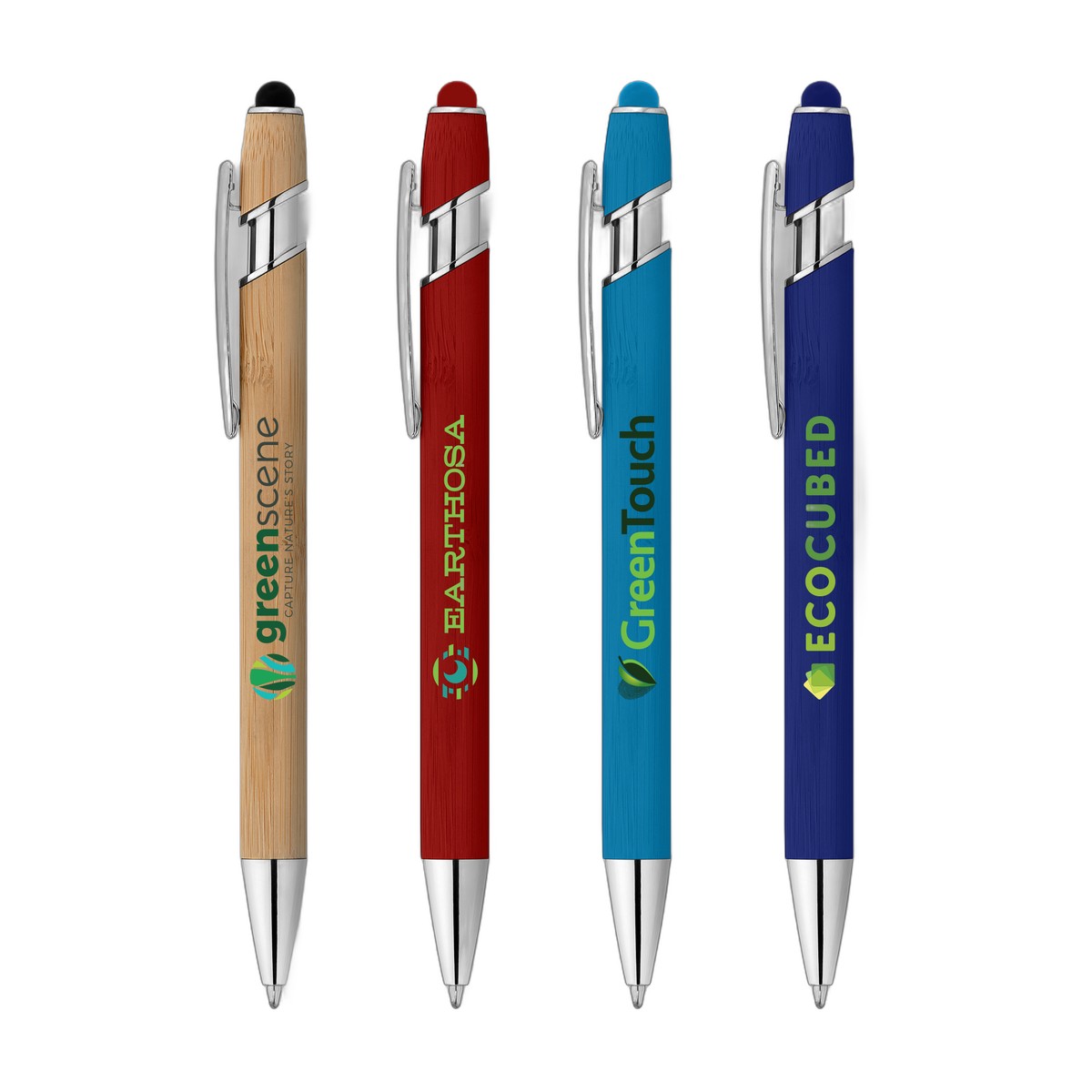 The Ellipse Bamboo Stylus Pen is popular for Earth-conscious brands and provides a natural look that customers love. Chrome accents add a sophisticated flair to the classic slim refillable pen with a touchscreen-compatible stylus. This promotional marketing writing instrument is excellent for spreading brand awareness on the go! Distribute at trade shows, large-scale events, and as an employee recognition gift. . Complies with Prop 65. 5.65" W x 0.41" D