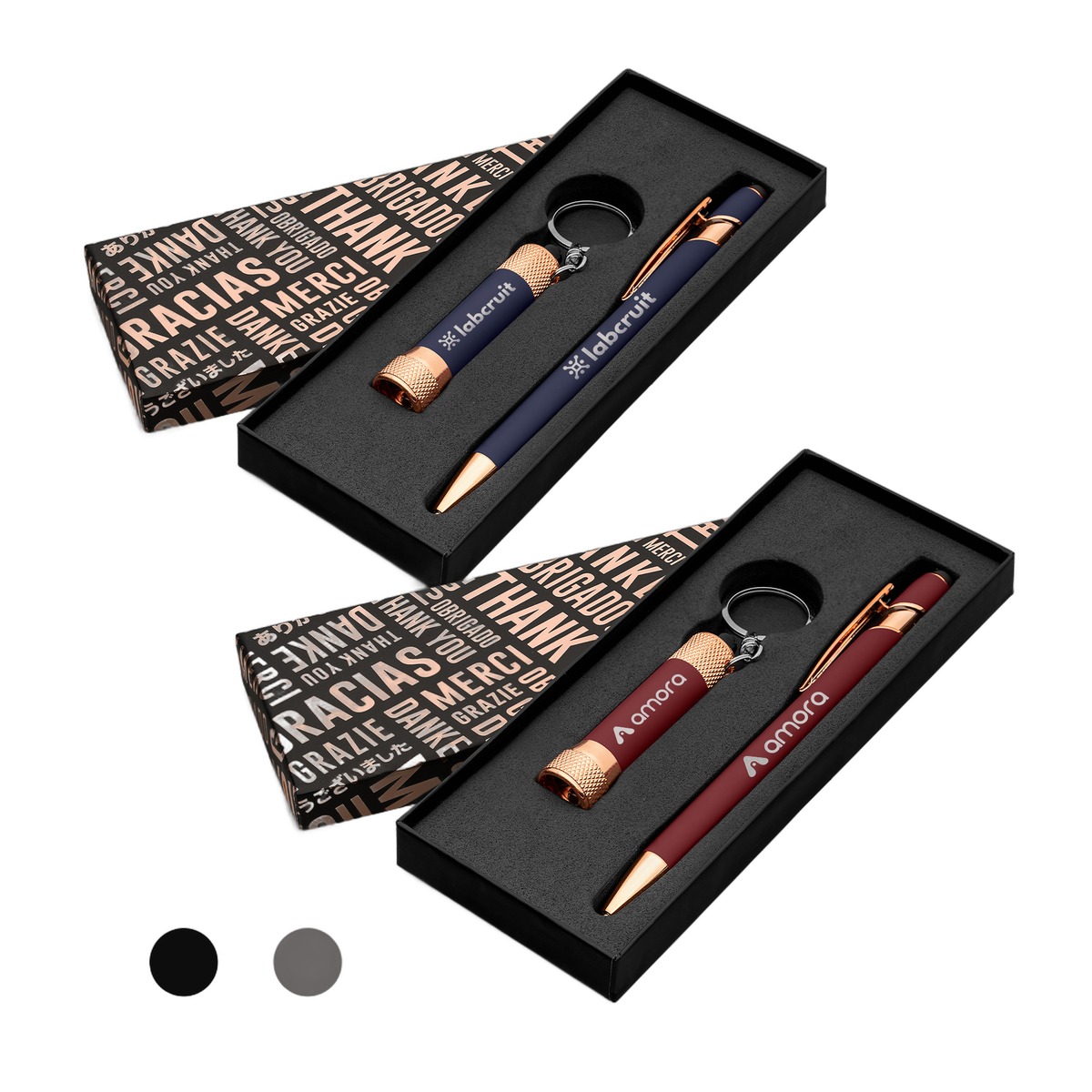 This gift set brings together two of our new rose gold trimmed soft-touch products, the Ellipse Softy ballpoint pen and Chroma Softy LED flashlight. Choose from a variety of classic colors to showcase your company name, logo or advertising information. Both products are imprinted in full-color with ColorJet, and presented in an attractive box with "Thank You" set in metallic rose gold text in multiple languages - a thoughtful way to express gratitude to your employees, business associates and clients. Complies with Prop 65. 6.84" H x 2.84" W x 0.71" D
