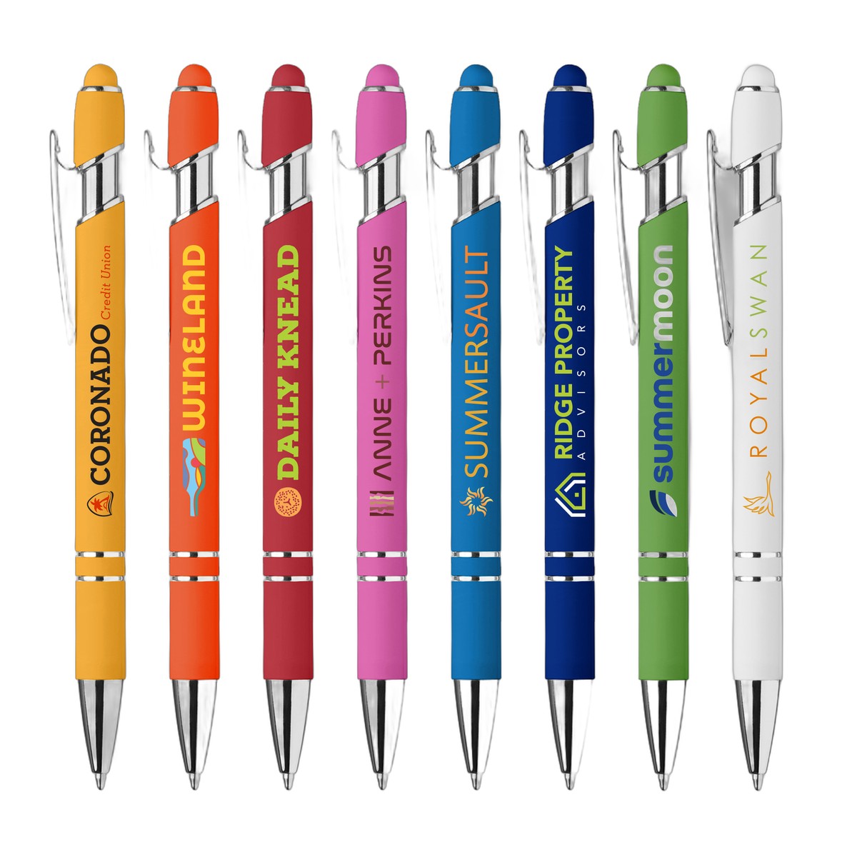Introducing the Ellipse Softy Brights Gel Pen w/Stylus – a vibrant and versatile writing instrument designed for a smooth and stylish writing experience. Crafted from Aluminum and featuring a bright colored rubber barrel and adorned with a chrome metal trim, this pen exudes a modern and polished look. The Stylus, matching the barrel color, adds a touch of convenience for navigating digital screens seamlessly. Your logo will be imprinted in Full ColorJet. Complies with Prop 65. 5.65" W x 0.39" D
