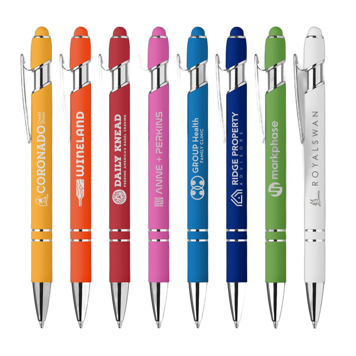 Introducing the Ellipse Softy Brights Gel Pen w/Stylus – a vibrant and versatile writing instrument designed for a smooth and stylish writing experience. Crafted from Aluminum and featuring a bright colored rubber barrel and adorned with a chrome metal trim, this pen exudes a modern and polished look. The Stylus, matching the barrel color, adds a touch of convenience for navigating digital screens seamlessly. Your logo will be imprinted in Full ColorJet. 5.65" W x 0.39" D