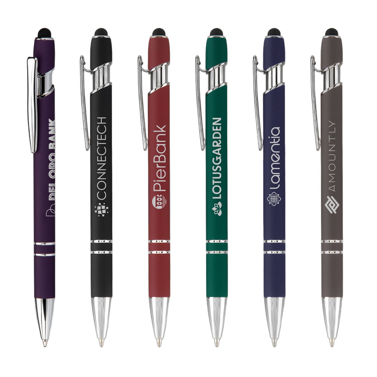 Introducing the Ellipse Softy Gel Pen w/Stylus – a stylish and practical writing tool that effortlessly combines elegance with technology. The pen showcases an Aluminum Rubber Barrel with a Chrome Metal clip, providing a polished appearance. The Chrome-painted plastic Nosecone adds a hint of sophistication, paired with the convenient Black Plunger and Stylus for contemporary functionality. Your logo will be imprinted in Laser Engraving. Complies with Prop 65. 5.65" W x 0.39" D