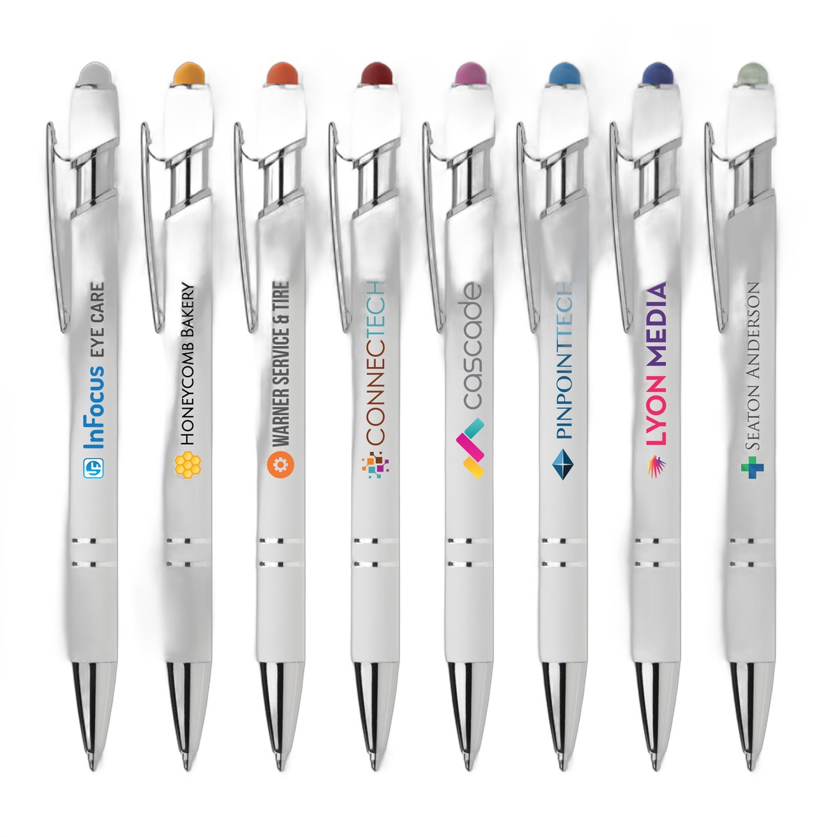 The Ellipse Softy White Barrel with Stylus is a stylish, premium metal pen with medium ballpoint, black ink. Choose from a variety of bright stylus colors that are the perfect punctuation to the white soft touch barrel. This is the ideal canvas for your company's logo imprinted in ColorJet, our full-color, photo-quality direct imprint process that makes it easy to show your brand's true colors. This bright, classic promotional metal pen will be a favorite at conventions, trade shows, corporate events and more! Complies with Prop 65. 5.65" W x 0.39" D