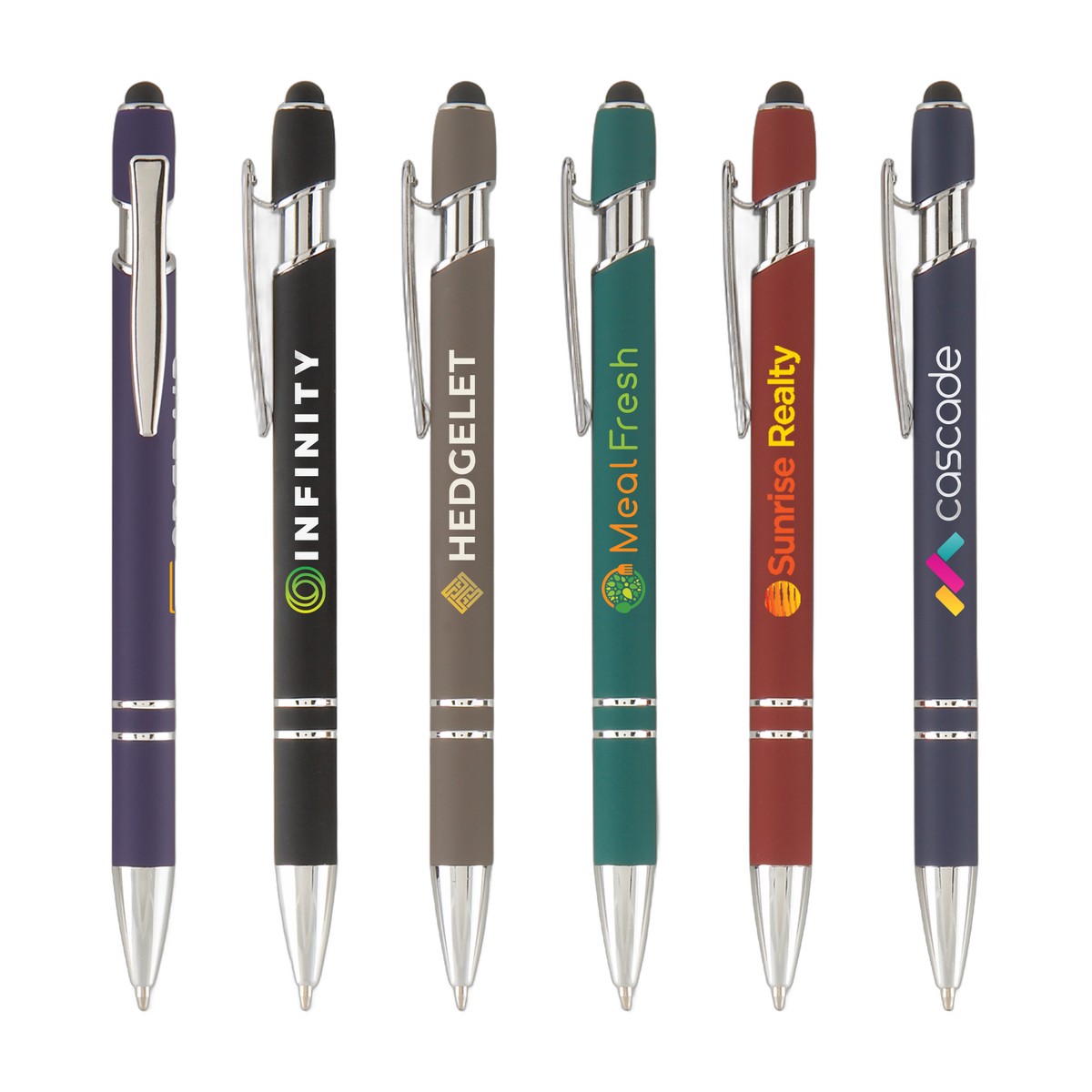 The Ellipse Softy with stylus is a stylish, premium metal pen available in your choice of black or blue medium ballpoint ink. Choose from a variety of rubberized soft touch product colors to showcase your company name, logo or advertising information. Customize this pen using ColorJet, our full-color, photo-quality direct imprint process that makes it easy to show your brand's true colors. This eye-catching promotional pen will be a favorite at conventions, trade shows, corporate functions and more!