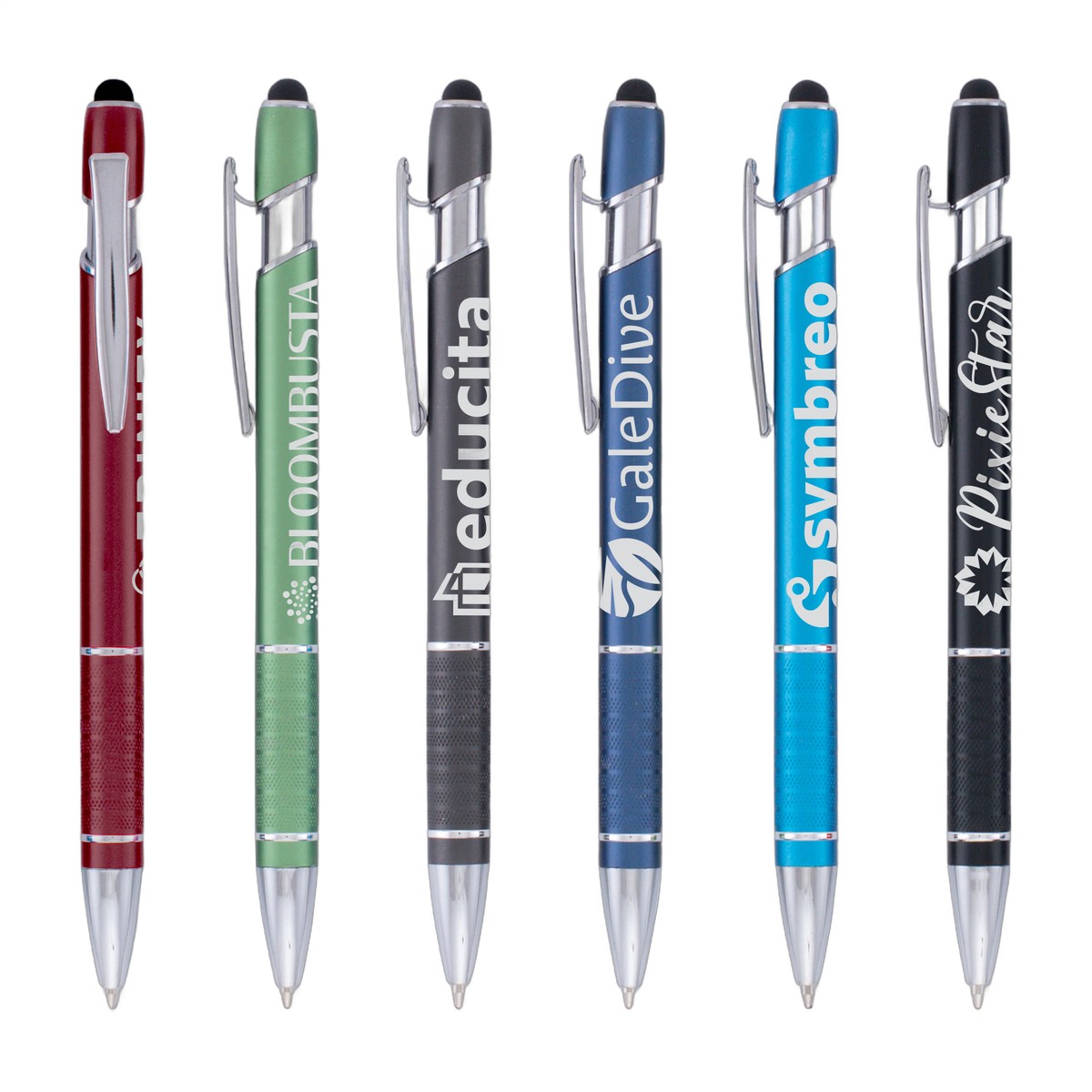 Remind new and potential customers that your company is a cut above the rest when you advertise on the Ellipse Stylus! This black medium ballpoint pen has a stylus situated at the top end. Additionally, it features a unique grip design, chrome metal clip, matte finish barrel and a click action plunger. It's available in several gorgeous product colors. Reach out to your customers and let them be the envy of everyone around them while they show off your brand! Customize it with our sharp-looking standard laser engraving. Complies with Prop 65. 5.63" W x 0.39" D