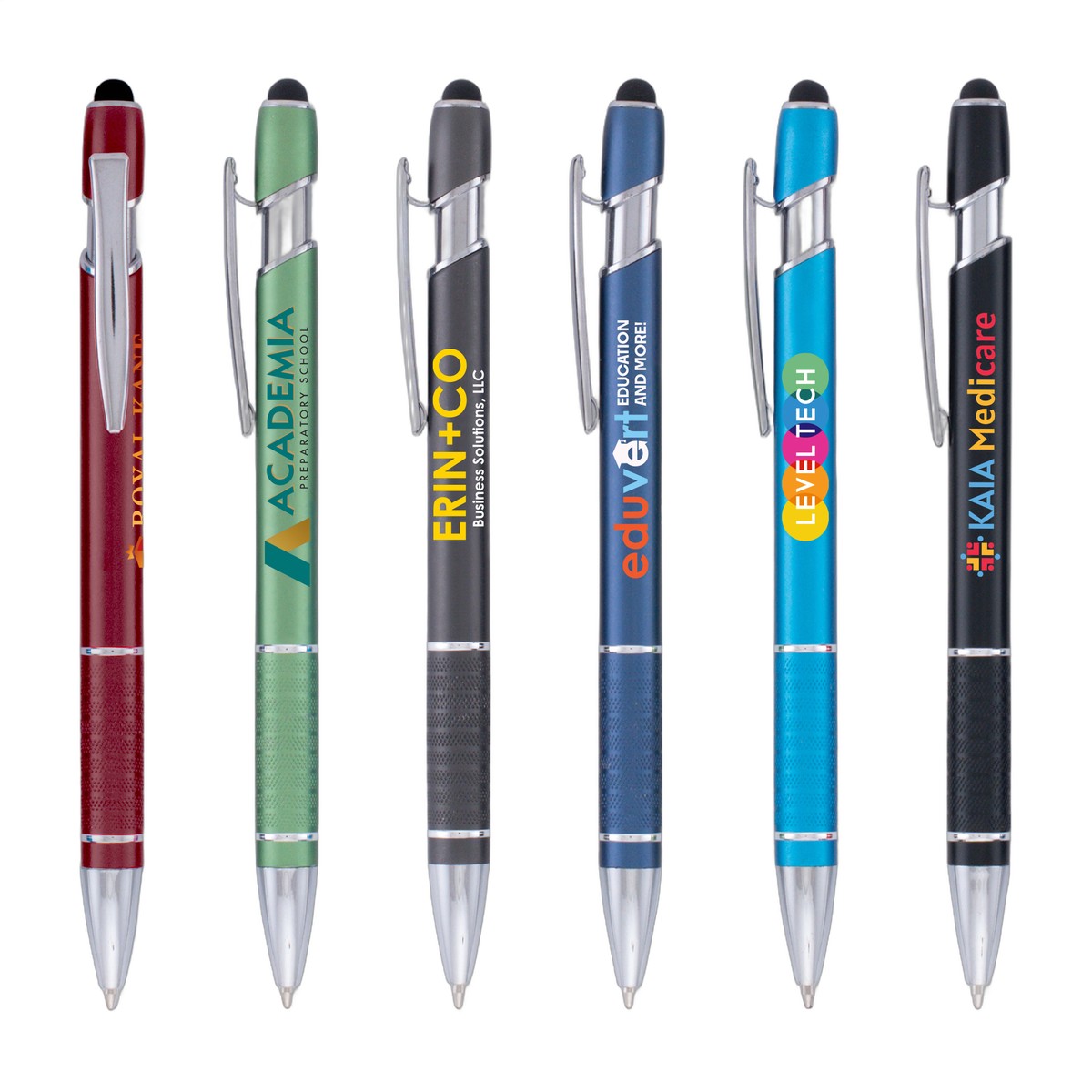 Remind new and potential customers that your company is a cut above the rest when you advertise on the Ellipse Stylus! This black medium ballpoint pen has a stylus situated at the top end. Additionally, it features a unique grip design, chrome metal clip, matte finish barrel and a click action plunger. It's available in several gorgeous product colors. Reach out to your customers and let them be the envy of everyone around them while they show off your brand! Customize it with our sharp-looking standard laser engraving. 5.63" W x 0.39" D
