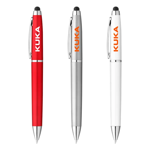 Twist-action ballpoint pen. Matte metallic, shiny white, or solid color barrel with shiny silver accents. Capacitive stylus tip. Black ballpoint ink. 5.5625" D x 0.5" W