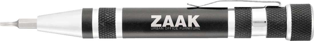The Engineer Multi-Tool includes eight screwdriver bits (two Phillips bits, three star head bits, one flathead bit, one bent flathead bit, and one spanner bit). It also includes a twist-off cap for bit storage, a magnetic base and a durable metal clip. Laser engraving is recommended. 4.38" D x 0.56" W x 0.56" H
