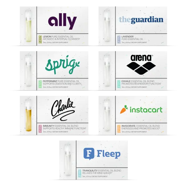 Oil Sample Vial with Card. Available in the following blends: Exhale, Immunity, Invigorate, Tranquility, Peppermint, Lavender, and Lemon. Use stock background or customize front and back of card. Complies with Prop 65. 3 1/2" H x 2" W
