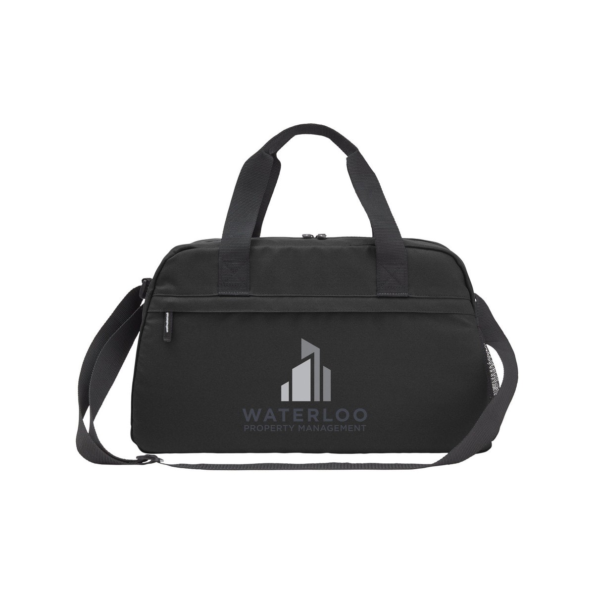 Weekender bag made of 600D Recycled Polyester. Whether you're hitting the gym, going on a weekend trip or simply need a reliable bag for your daily commute, this duffel has you covered. Large main compartment, front zip pocket, side mesh bottle pocket, inside pocket to hold small valuables. Adjustable shoulder strap, carry handles with snap wrap. 50% of this item's total composition is made from recycled materials, and the fabrics themself contains 100% post-consumer recycled content. Recommended weight tolerance: 22 lbs. 18.5000" W x 11.0000" H x 8.7000" D