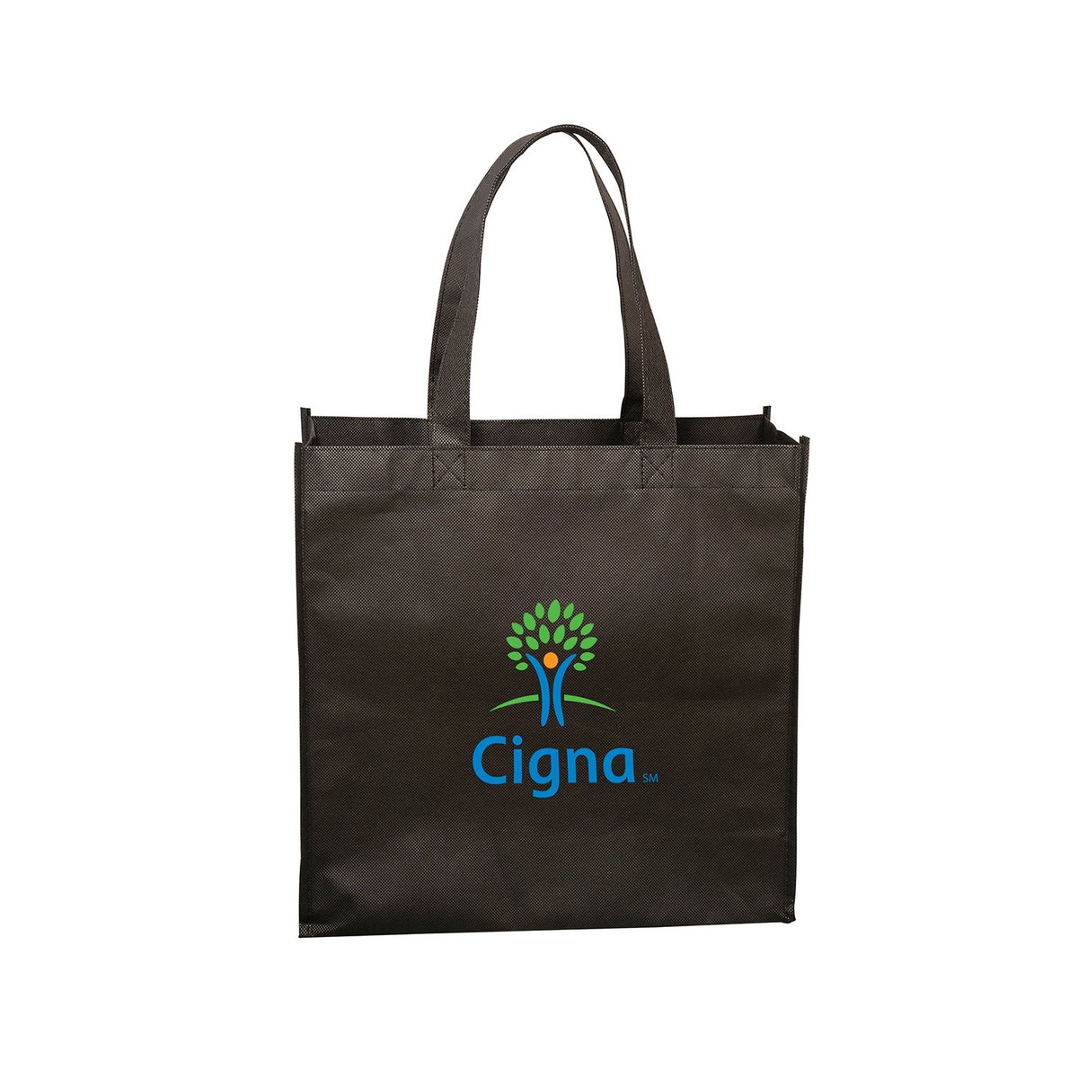 80 GSM Non-Woven Polypropylene, basic square tote with open main compartment. Features 18"l handles. This reusable tote bag is a great alternative to single-use plastic bags. Recommended weight tolerance: 11 lbs. 13.0000" W x 13.0000" H x 4.7000" D