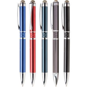 Multifunction executive pen features exclusive microfiber stylus. The high gloss enamel and chrome with diamond etched center band set it apart and the stylus provides increased connectivity with high tech devices. Features supersmooth bold black ink. Material: Metal Standard Decoration Includes: Lasered, 1 Location All Available Decoration Options: Laser Engraved: 1.25" W x 0.25" H Cap Revolution Engraving: 1.5" W x 0.5" H Barrel Revolution Engraving: 1.25" W x 0.5" H Cap Tip Type: Ballpoint Mechanism: Push Retractable Standard Packaging: Individually Cellophaned Tags: popular, metal, tech, accessory, phone, tablet, gift, desk, office, executive, advertisement, college, grade, writing, merchandise, study, high school, pen, essay, list