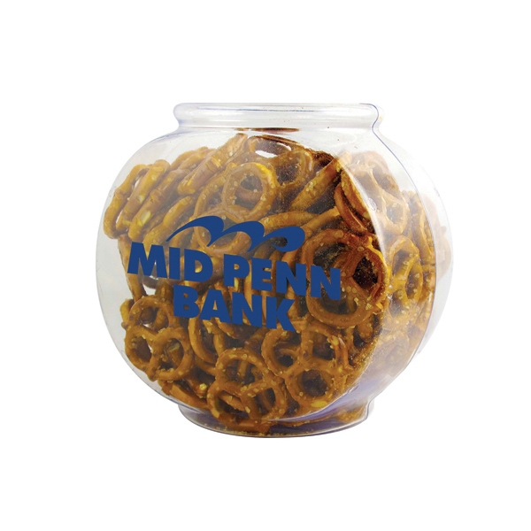 Your campaign will go swimmingly when you hand out this fun-filled treat! Measuring 5 1/2" W x 3 5/8" D x 5 3/8" H, this fish bowl is filled with salted mini pretzels. Ideal for trade shows, corporate events, fairs and festivals, have your company name and logo imprinted on the surface for a customized souvenir that everyone can enjoy. A delicious desk accessory for the office, select this non melt product as your next promotional giveaway!