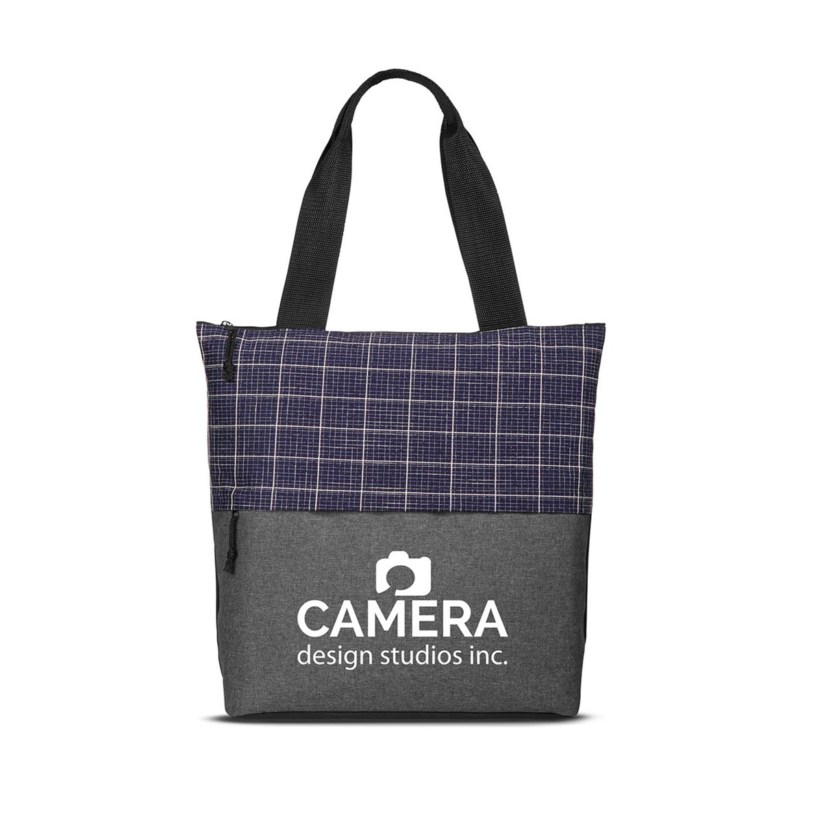 Top zipper closure tote made of 600D Polyester with PVC backing and Polyester Gridcloth flannel upper panel. Front zipper pocket: 18.5"w x 9"h. Polyester web carry handles measuring approx. 23"l x 2"w. Spot clean only. Recommended weight tolerance: 15 lbs. 18.0000" W x 16.0000" H x 6.5000" D