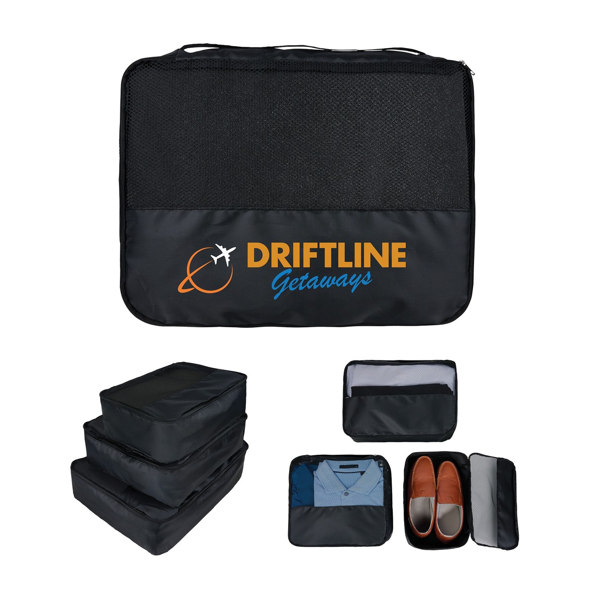 The Flynn 3-Piece Packing Cube Set is a convenient and versatile travel set designed to simplify packing and keep your belongings well organized. Made from recycled 210D polyester (RPET) with breathable mesh fabric, these lightweight packing cubes are a sustainable choice and provide easy visibility while helping maximize luggage space. The three assorted sizes are ideal for separating clothing, shoes, and accessories, and each cube features carrying handles for easy transport and handling. Complies with Prop 65. 15" W x 11 3/4" H x 4 1/4" D