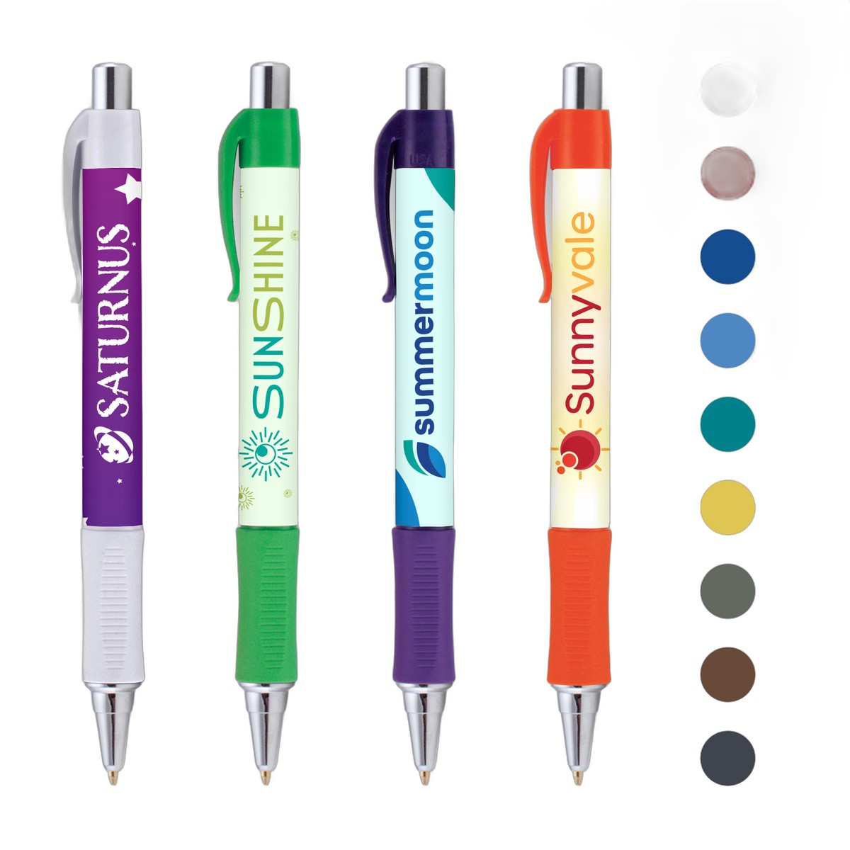 Keep your idea of success in sight with the help of the Vision Grip Pen! One of the industry's highest valued wide body pens, it's accented in bright chrome trim and features our SimpliColor (TM) printing process. This gives you one of the largest one to four color process imprints in the market. Our gel-like Eversmooth (R) hybrid ink gives an extraordinary writing experience in black and blue ink choices for this plastic pen.