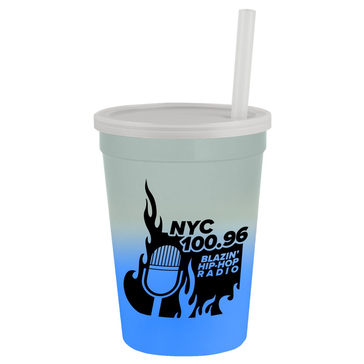 Take your drinkware to the next level with this 12 oz. smooth-sided reusable stadium cup complete with a press-on lid and straw. Fill it with ice-cold liquid and watch as the cup transforms colors before your eyes, making every sip a little more fun. Perfect for parties, sporting events, and company gatherings, this American-made cup offers a durable, reusable alternative to disposable drinkware while keeping spills at bay. Complies with Prop 65. 3.125" W x 4.125" H x 3.125" D