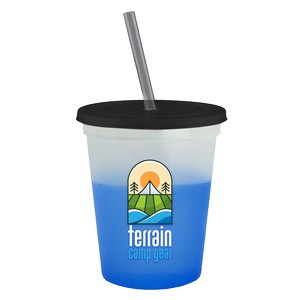 Take your drinkware to the next level with this 16 oz. smooth-sided reusable stadium cup complete with a press-on lid and straw. Fill it with ice-cold liquid and watch as the cup transforms colors before your eyes. Perfect for parties, sporting events, and company gatherings, this American-made cup offers a durable alternative to disposable drinkware while keeping spills at bay. Plus, you can mix and match lid and cup colors for even more fun. Complies with FDA. 3.625" W x 4.375" H x 3.625" D