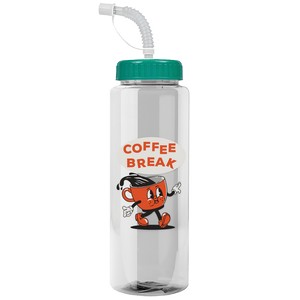 Fuel your day with this 32 oz. transparent straight-wall bottle, designed for outdoor adventures and daily use. The lid has a flexible straw with a tethered cap that offers quick and easy sipping, while the large capacity ensures you stay hydrated wherever you go. Mix and match bottle and lid colors to make it your own, and upgrade with an optional Motivational Measurement imprint on the second side, available at no extra charge when using the same screen print ink color as your side-one imprint. Complies with ANSI, CPSIA, FDA, Prop 65. 3.25" W x 9.25" H x 3.25" D