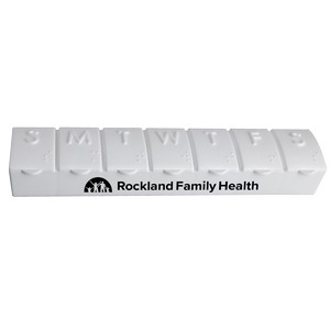 This large seven-compartment pill box helps keep your medication organized throughout the week. Each compartment features a snap-lid closure, as well as day-of-the-week and Braille markings. Complies with ANSI, CPSIA, FDA, Prop 65. 8.375" W x 1" H x 1.625" D