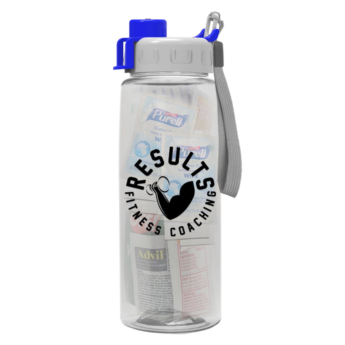 Stay prepared wherever adventure takes you with this versatile 26 oz. Tritan® bottle. The wide-mouth opening makes it easy to fill, clean, and add ice, while the sip-through spout with snap cover helps prevent spills. A convenient wrist strap ensures easy carrying, and the bottle comes packed with outdoor essentials, including pain relief, hand sanitizer, insect repellent, sunscreen, and first aid supplies, so you?re ready for any minor setbacks while exploring. Complies with ANSI, CPSIA, FDA, Prop 65. 3.125" W x 3.125" H x 9" D
