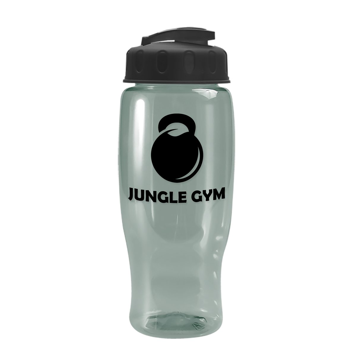 Quench your thirst while on the go with this 27 oz. transparent, contoured bottle, designed with a tapered bottom that fits most cup holders. The drink-through, flip-top lid allows for quick sips, making it a perfect companion for gyms, outdoor events, or everyday hydration. Mix and match lid and bottle colors for a customized look that matches your brand?s style. 98% of total product made from post-consumer recycled PET. 3.5" W x 8.75" H x 3.5" D