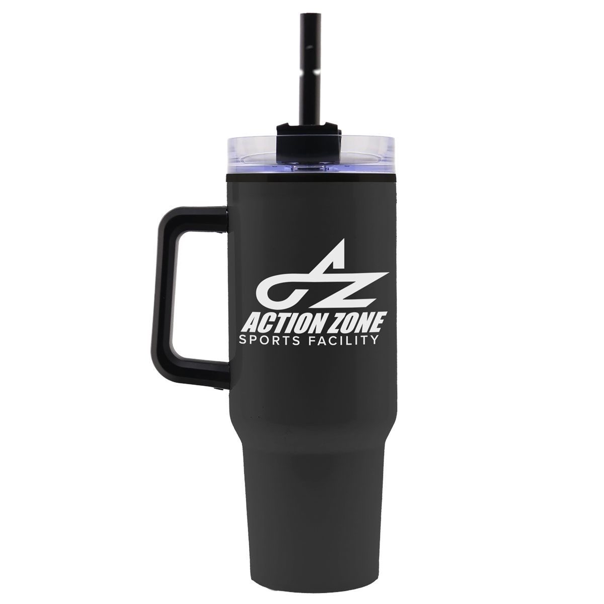 Enjoy all-day refreshment with this 40 oz. handled stainless steel tumbler. Designed with double-wall insulation, it keeps beverages hot or cold for hours, and the clear, screw-on lid features a spill-resistant design with a straw for versatile sipping. This travel mug is an exceptional choice for companies, universities, and nonprofits ready to take their brand wherever it roams. Complies with ANSI, CPSIA, FDA, Prop 65. 3.75" W x 10.125" H x 3.75" D