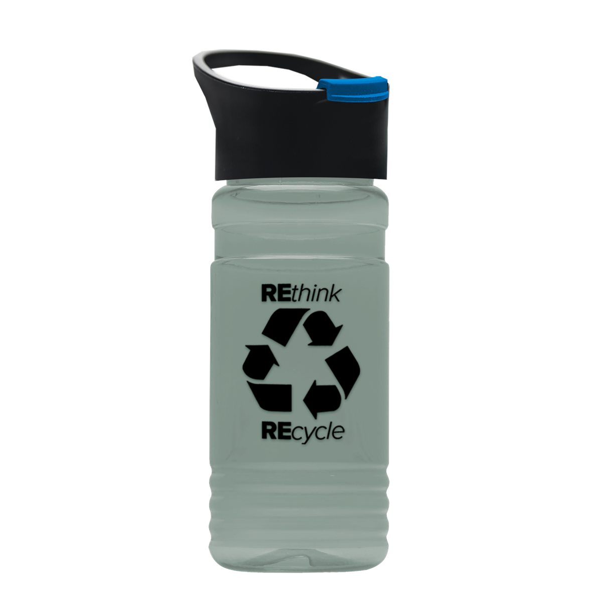 Stand out with this 20 oz. bottle featuring a unique straight-wall cylinder design and compact shape. Molded with 98% post-consumer recycled PET, it?s a reusable, sustainable option for everyday hydration needs. The convenient sip-through lid with pop-up cover makes it ideal for an on-the-go lifestyle, while mix-and-match lid and bottle color options let you create a unique look. Complies with ANSI, CPSIA, FDA, Prop 65. 2.875" W x 8" H x 2.875" D