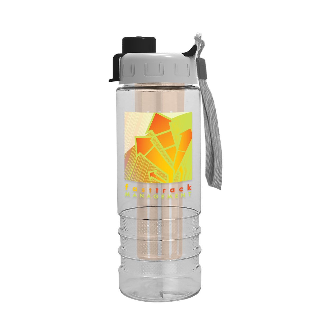 This 24 oz. transparent bottle features a textured, grip-enhancing base that?s built for easy handling on any adventure or outing. A sip-through spout with a quick-snap cover keeps spills at bay, and the included infuser holds fruits, herbs, or vegetables, providing a fresh flavor to water. The wide opening allows for effortless filling and cleaning. Mix and match bottle, lid, and infuser colors to create a unique look that highlights your brand?s personality. Complies with ANSI, CPSIA, FDA, Prop 65. 2.875" W x 9" H x 2.875" D