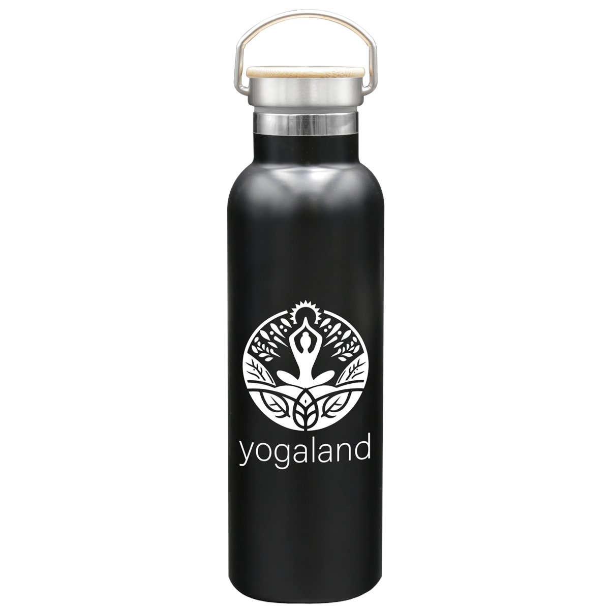 **CLOSEOUT WHILE SUPPLIES LAST** Sip in style with this 20 oz. vacuum-sealed stainless steel bottle, designed to keep beverages hot or cold for hours. The screw-on, spill-resistant lid features bamboo details and has a handle for easy hydration on the go. Whether you?re powering through the workday or heading out on your next adventure, this bottle helps you stay refreshed and ready to go. Complies with Prop 65. 3" W x 9" H x 3" D