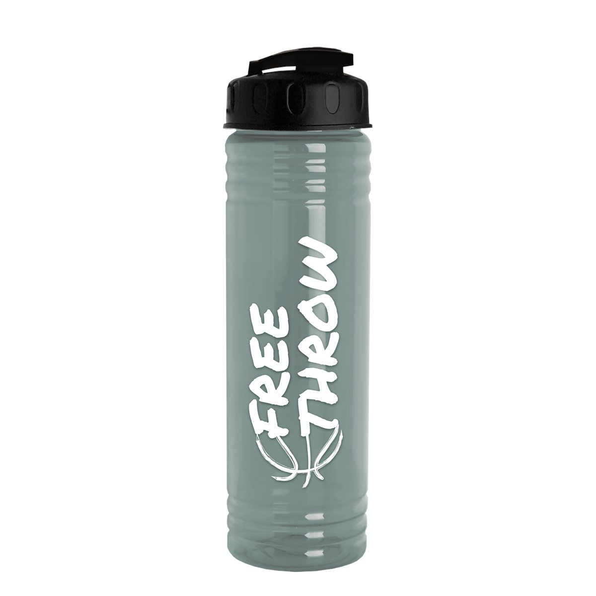 Stay refreshed with this 24 oz. RPET bottle featuring raised ring accents. The drink-through, flip-top lid makes on-the-go hydration a breeze, and its slim design fits most cup holders. Mix and match bottle and lid colors to create a custom look, and upgrade with an optional Motivational Measurement imprint on the second side to easily track daily water intake. This feature is available at no extra charge when the screen print ink color is the same color as your side-one imprint. Bottle molded with 98% post-consumer recycled PET. Complies with ANSI, CPSIA, FDA, Prop 65. 2.75" W x 9.75" H x 2.75" D