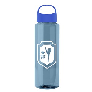 Power through your day with this 32 oz. RPET bottle that?s made to keep you hydrated longer. The screw-on lid with built-in handle makes it easy to grab and go, while mix-and-match bottle and lid colors let you create a look all your own. Add the optional Motivational Measurement imprint on the second side to track your water intake; it?s free when the screen print ink color matches your side-one imprint. Bottle molded with 98% post-consumer recycled PET. 3.25" W x 9.25" H x 3.25" D