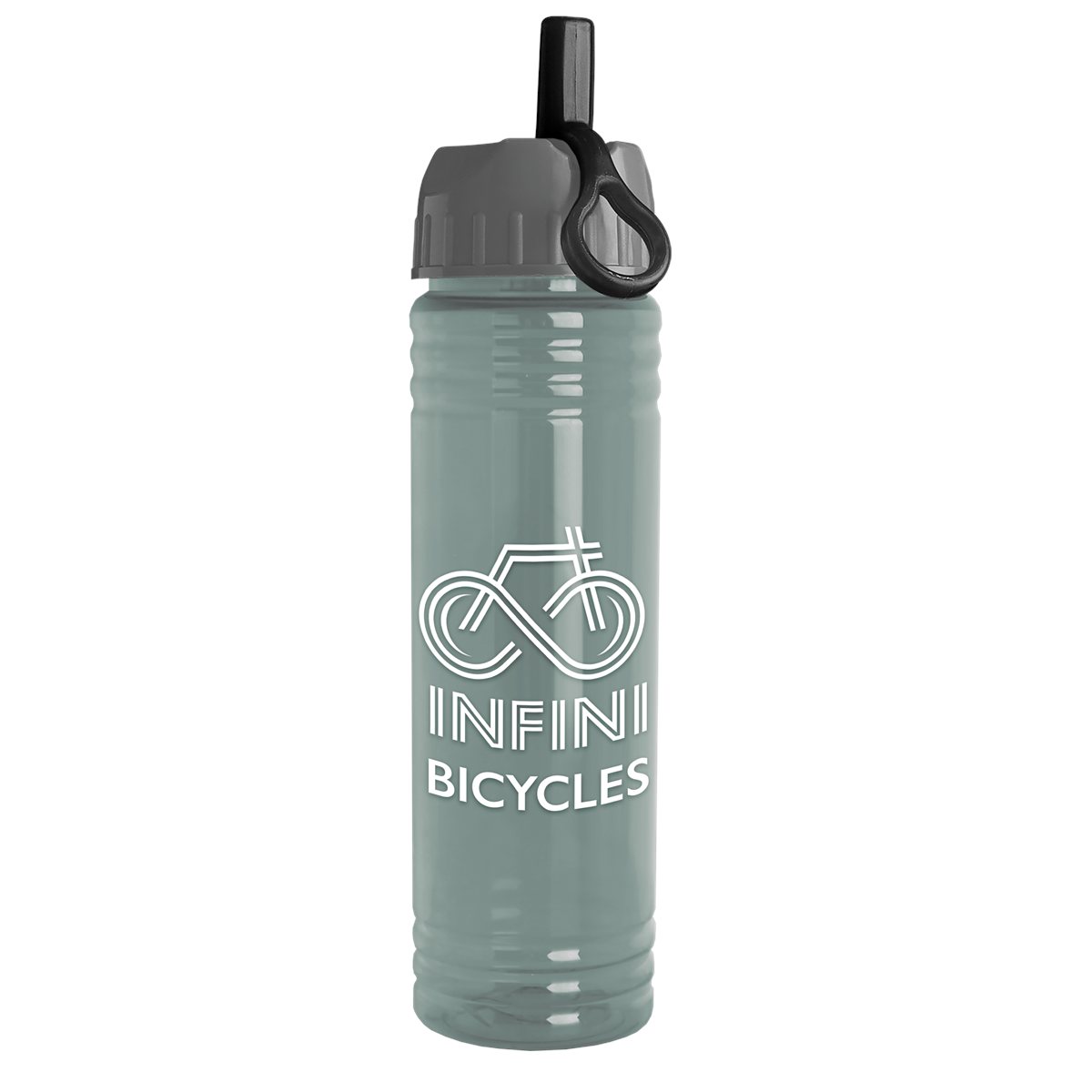 Stay refreshed with this 24 oz. RPET bottle featuring raised ring accents. The flip-straw lid has a built-in carry ring that makes on-the-go hydration a breeze, and its slim design fits most cup holders. An optional Motivational Measurement imprint on the second side makes it easy to track your daily water intake, available at no extra charge when the screen print ink color is the same color as your side-one imprint. Bottle molded with 98% post-consumer recycled PET. Complies with ANSI, CPSIA, FDA, Prop 65. 2.75" W x 9.75" H x 2.75" D