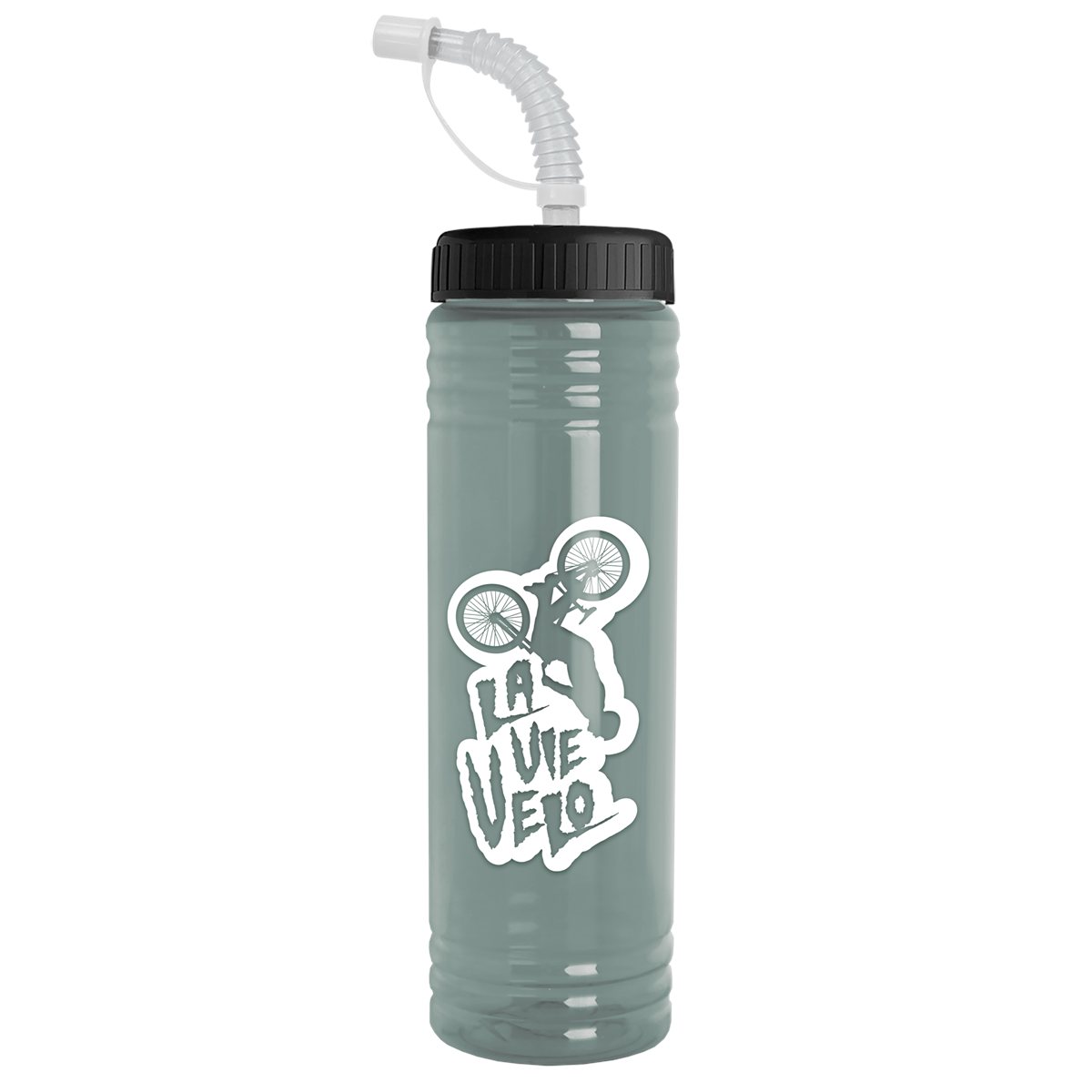 Stay refreshed with this 24 oz. RPET bottle featuring raised ring accents. The lid has a flexible straw lid with a tethered cap that makes on-the-go hydration a breeze, and its slim design fits most cup holders. Mix and match bottle and lid colors to create a custom look, and upgrade with an optional Motivational Measurement imprint on the second side to easily track daily water intake. This feature is available at no extra charge when the screen print ink color is the same color as your side-one imprint. Bottle molded with 98% post-consumer recycled PET. Complies with Prop 65. 2.75" W x 9.25" H x 2.75" D