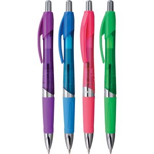 Eye-catching promotional pen with unique details and a budget price. Features jumbo barrels in translucent brights with chrome trim. Shapely and colorful comfort grip for writing ease. Includes a Hub branded silver band. High value at budget price. (Pat #D825,663). Material: Plastic Standard Decoration Includes: 1 Color, 1 Location All Available Decoration Options: Silk Screen: 1.13" W x 0.63" H Barrel Tip Type: Ballpoint Mechanism: Push Retractable Click Here For Virtual Proofing Tool [https://www.hpgspectra.com/?item=304/] Standard Packaging: Bulk Tags: plastic, cost effective, popular, pen, tradeshow, trade, show, desk, office, advertisement, college, grade, writing, merchandise, study, high school, university, essay, list, home