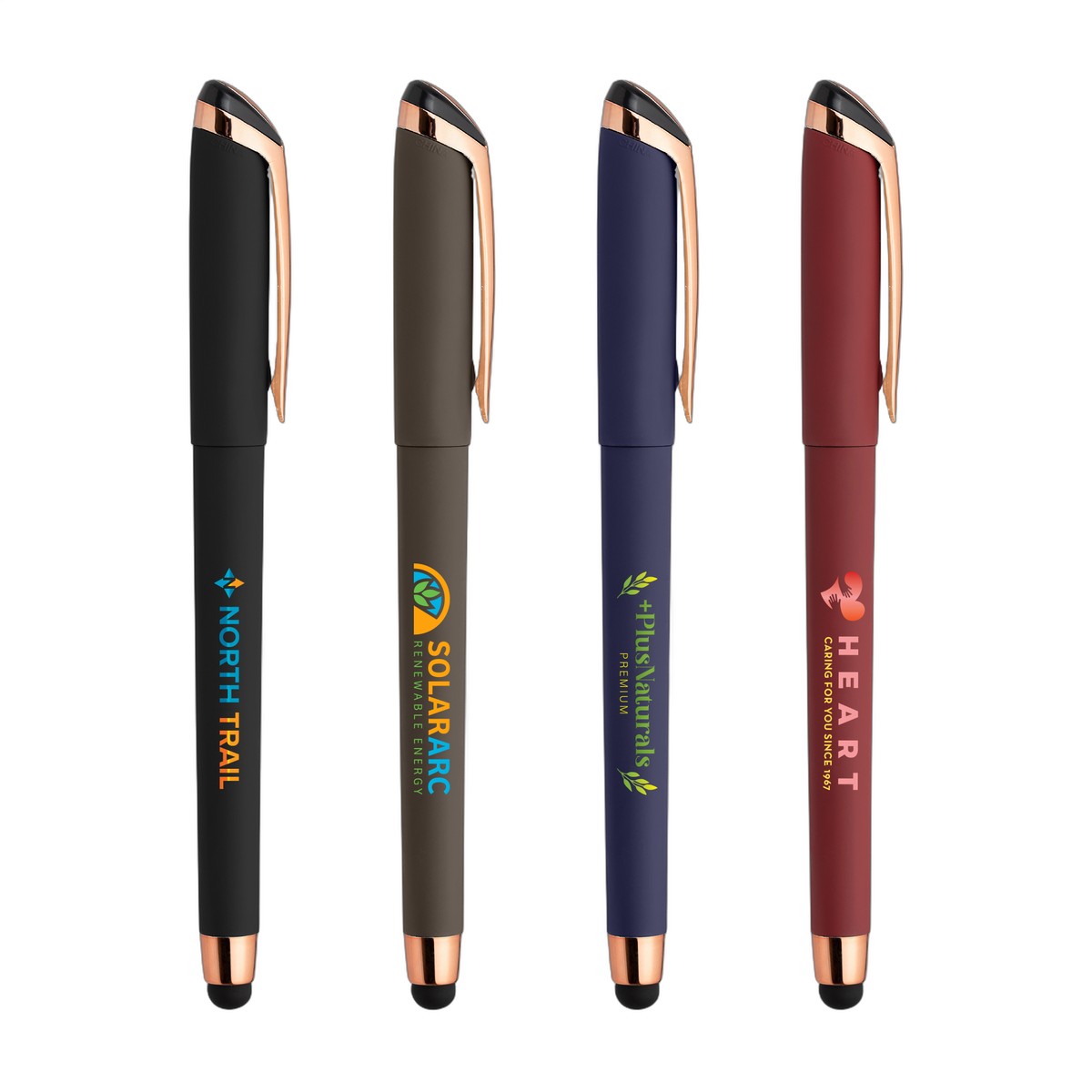Our Gazelle Gel Pen will be a fast favorite with your customers - they'll love the luxurious soft-touch barrel and matching cap, curvaceous rose gold accents, contoured grip, touchscreen-compatible stylus and smooth gel ink for a premium writing experience. Your brand will stand out with 1-color silkscreen imprint. Complies with Prop 65. 5.79" W x 0.44" D
