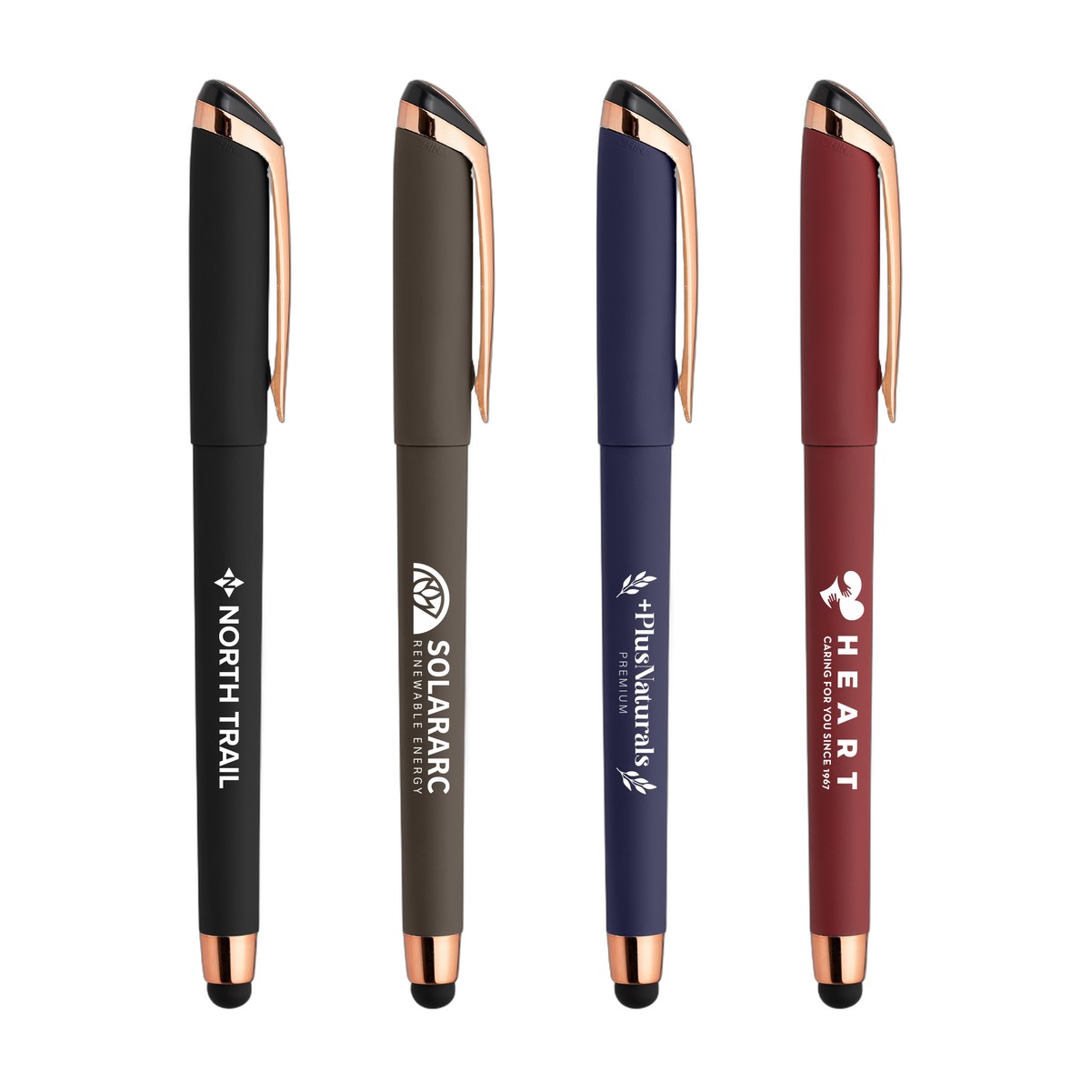 Our Gazelle Gel Pen will be a fast favorite with your customers - they'll love the luxurious soft-touch barrel and matching cap, curvaceous rose gold accents, contoured grip, touchscreen-compatible stylus and smooth gel ink for a premium writing experience. Your brand will stand out with 1-color silkscreen imprint. Complies with Prop 65. 5.79" W x 0.44" D