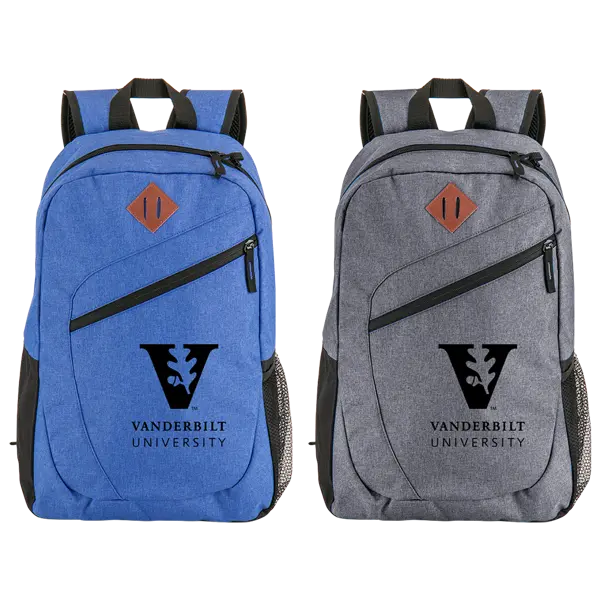 300D heathered polyester and 600D backpack with angled front pocket. PU leatherette patch; mesh water bottle pocket; padded back and adjustable shoulder straps. 5.5625" D x 17.5" H x 11.5" W