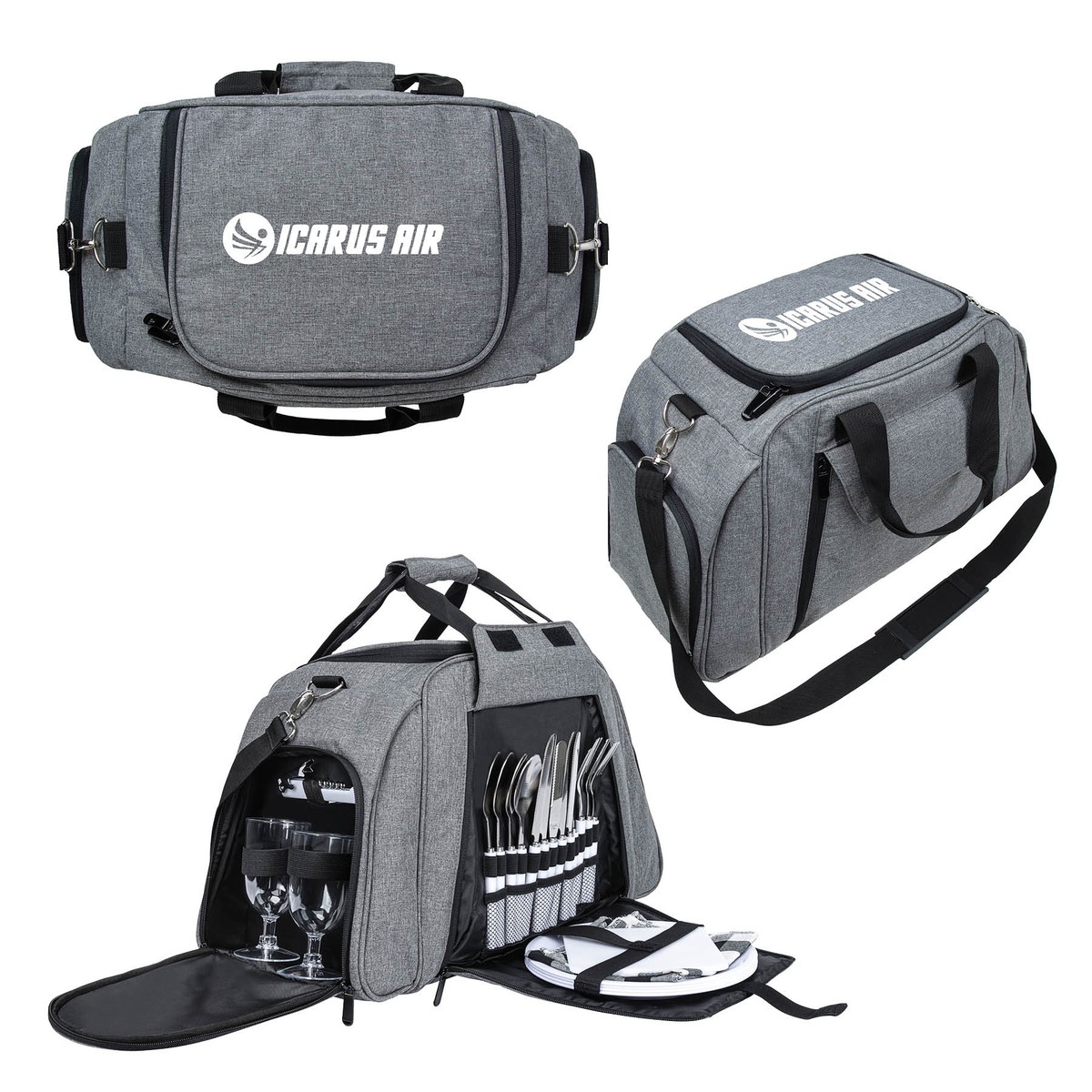 The Verona Picnic Cooler Duffel is constructed with durable 600D 2-tone polyester and features a four person serving set and a large 24-can PEVA lined insulated main compartment. The 2 side pockets hold four 6 oz. stemmed plastic cups, a corkscrew/bottle opener tool, and salt & pepper dispensers. The front pocket houses service for four including 9" plates, metal forks, knives, and spoons with plastic handles, napkins and one cutting board/serving tray. The Verona also features metal hardware, an 1 1/2" x 54" removable and adjustable shoulder strap with pad, and carry handles with a hook and loop pad. Complies with Prop 65. 20 7/8" W x 11 3/4" H x 8 1/4" D