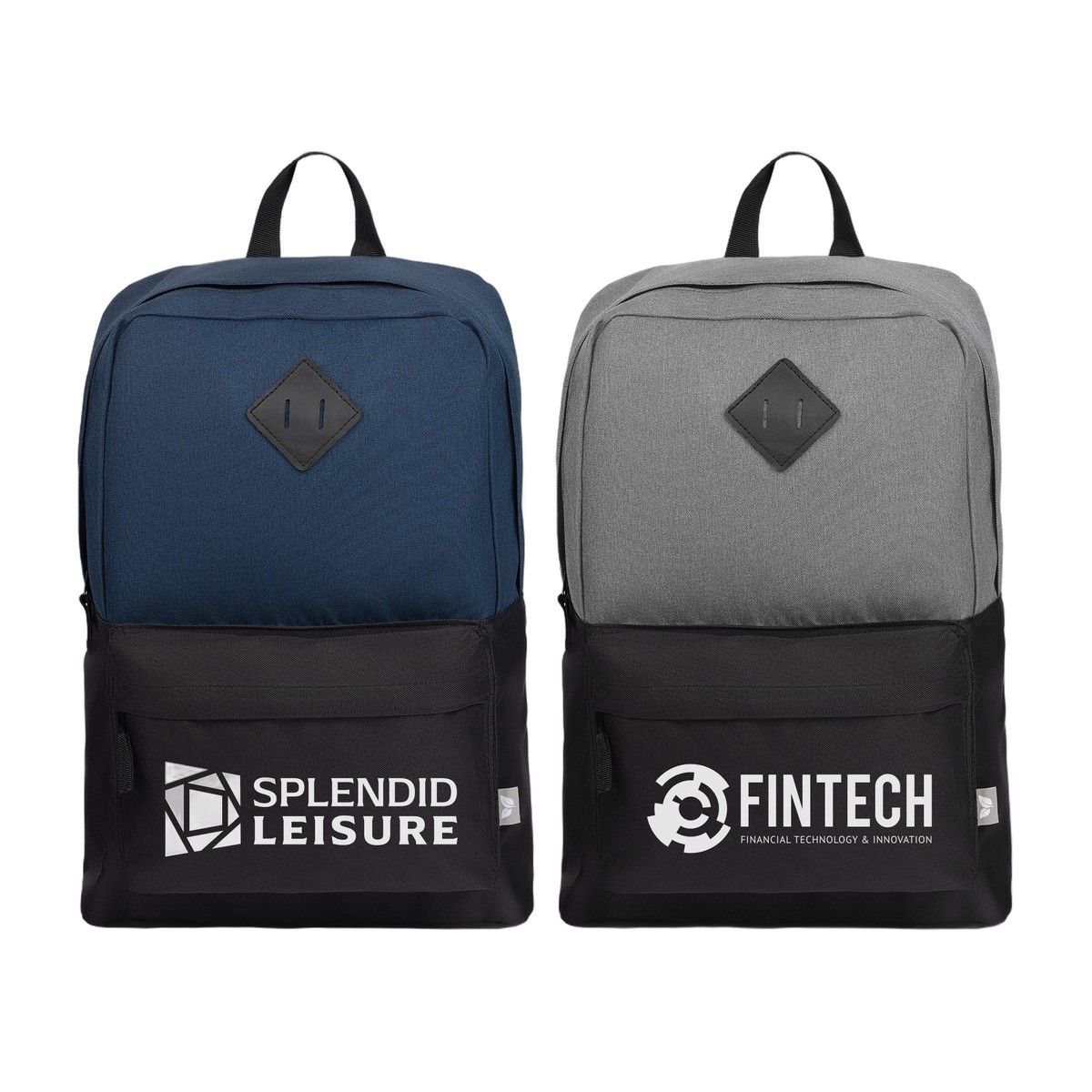Meet the Georgetown rPET Backpack, a perfect blend of style and functionality. Crafted from 100% 600D rPET polyester with PU backing. It has padded, adjustable straps, multiple interior pockets, and a padded sleeve that fits a range of laptops including 13", 14", 15", 16", and 17". Other features include a front pocket, a lash tab, black webbing on zipper pullers, a top handle, and a Jacquard tag. Measures 12.2" x 16.93" x 5.31"; capacity 17L; max weight 22 lbs. Complies with Prop 65. 16.93" H x 12.20" W x 5.14" D
