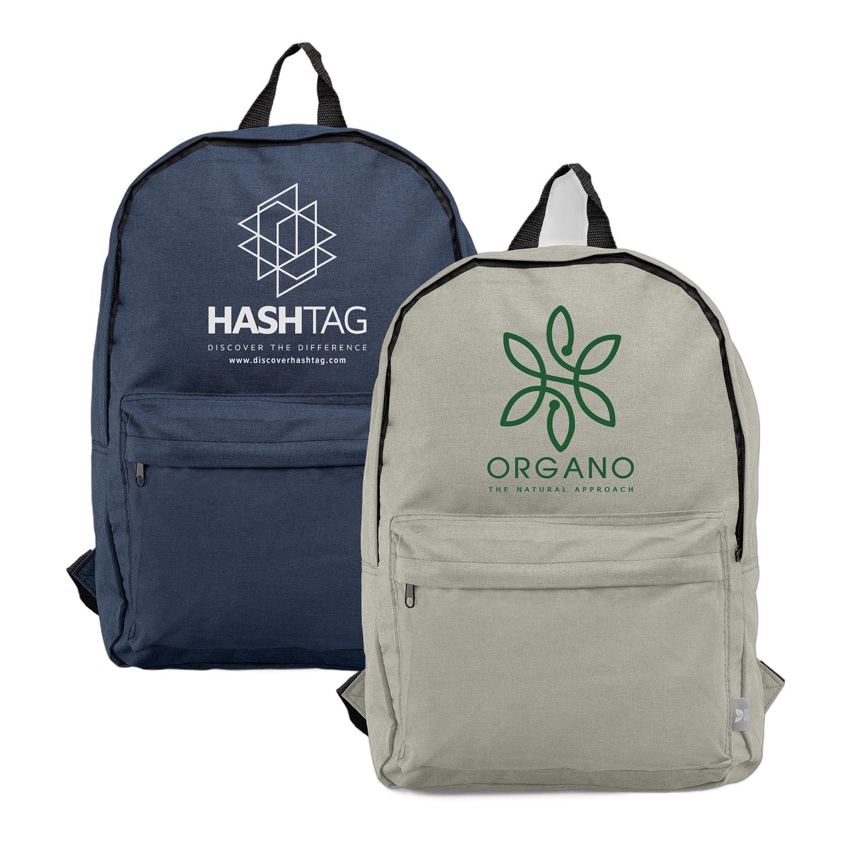 The Glasgow rPET Polyester Backpack is designed for everyday convenience and modern branding. Featuring a spacious main compartment, front zipper pocket, and durable design, this bag provides comfort and functionality for work, school, or travel.Key Features:Front zipper pocket for quick access to essentialsTop main compartment with zipper closurePadded cushion back for added comfortAdjustable shoulder straps and top grab handleFits laptops from 13" to 17"Benefits:Comfortable to carry, even for extended periodsHighly visible logo placement on classic color bagsSustainable rPET polyester construction supports conscious branding. Complies with Prop 65. 16.50" H x 12.00" W x 5.00" D