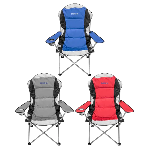 Comfy 600D padded chair folds-up and fits into matching color 210D polyester carry case with convenient black shoulder strap. Chair features: armrests with can holder; sturdy steel tube frame that supports up to 300 lbs. 20" D x 36" H x 32" W