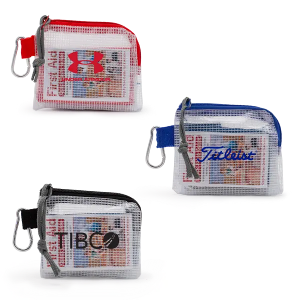 This branded golf safety and first aid kit is so darn useful and eye-catching that you'll never hit the links without it. For starters, the portable nylon zippered bag is tear-resistant. A silver carabiner allows you to clip to your golf bag and go! Contents: 1 Blister Bandage, 2 Ball Markers, 1 Golf Divot Tool, 3 Golf Tees, 1 Pair Tweezers, 4 Bandages (3/4" x 3") 10 Junior Bandages, 1 Antibacterial Wipe, 2 Alcohol Prep Pads, 3 BZK Antiseptic Wipes. Complies with Prop 65. 4.75" W x 4" H
