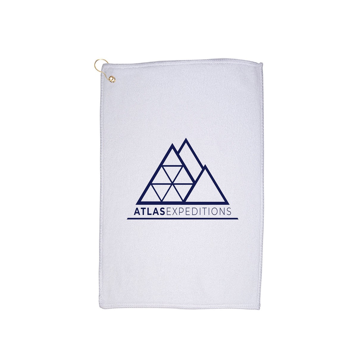 Hemmed golf towel made of 100% Cotton terry. 2.1 lb per doz. Includes metal grommet and hook on top left corner of each towel for attaching to golf bags, belt loops or pockets. Great for golf, country clubs, gyms and fitness centers, as well as bars and restaurants. Washing instructions: Machine wash cold. Do not bleach. Tumble dry medium. *24-hour rush service only applies to catalog quantities up to 750 units. 16.0000" W x 25.0000" H
