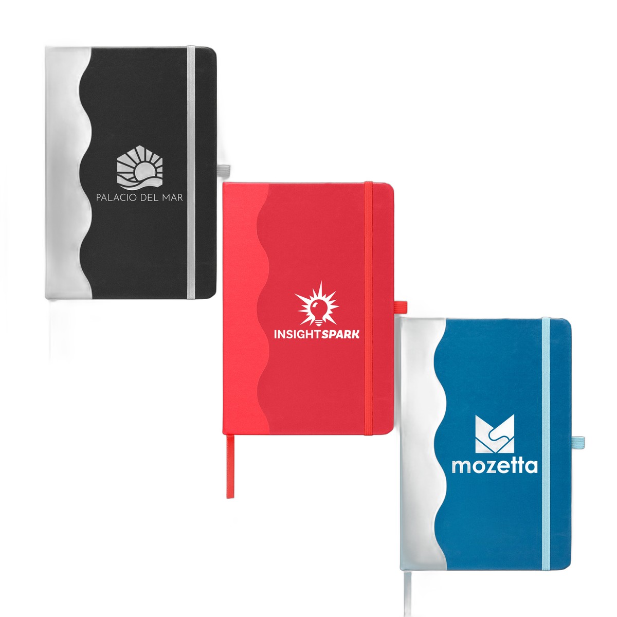 Our Grete Wave Pattern Journal is a sophisticated and swanky notebook with an upscale look. The cover is made from PU (polyurethane) with 33% recycled content, featuring a sleek and eye-catching printed wave pattern accent that runs across the spine and front/back. The premium design continues inside with a matching two-tone wave pattern printed on the interior covers. For convenience, the journal is complete with a color-matching elastic strap closure, an integrated elastic pen loop, and a satin ribbon bookmark. Inside, the journal contains 80 sheets of 70gsm FSC®-certified lined paper, making the Grete journal a complete and stylish package for all your note-taking needs. 8.27" H x 5.71" W x 0.67" D