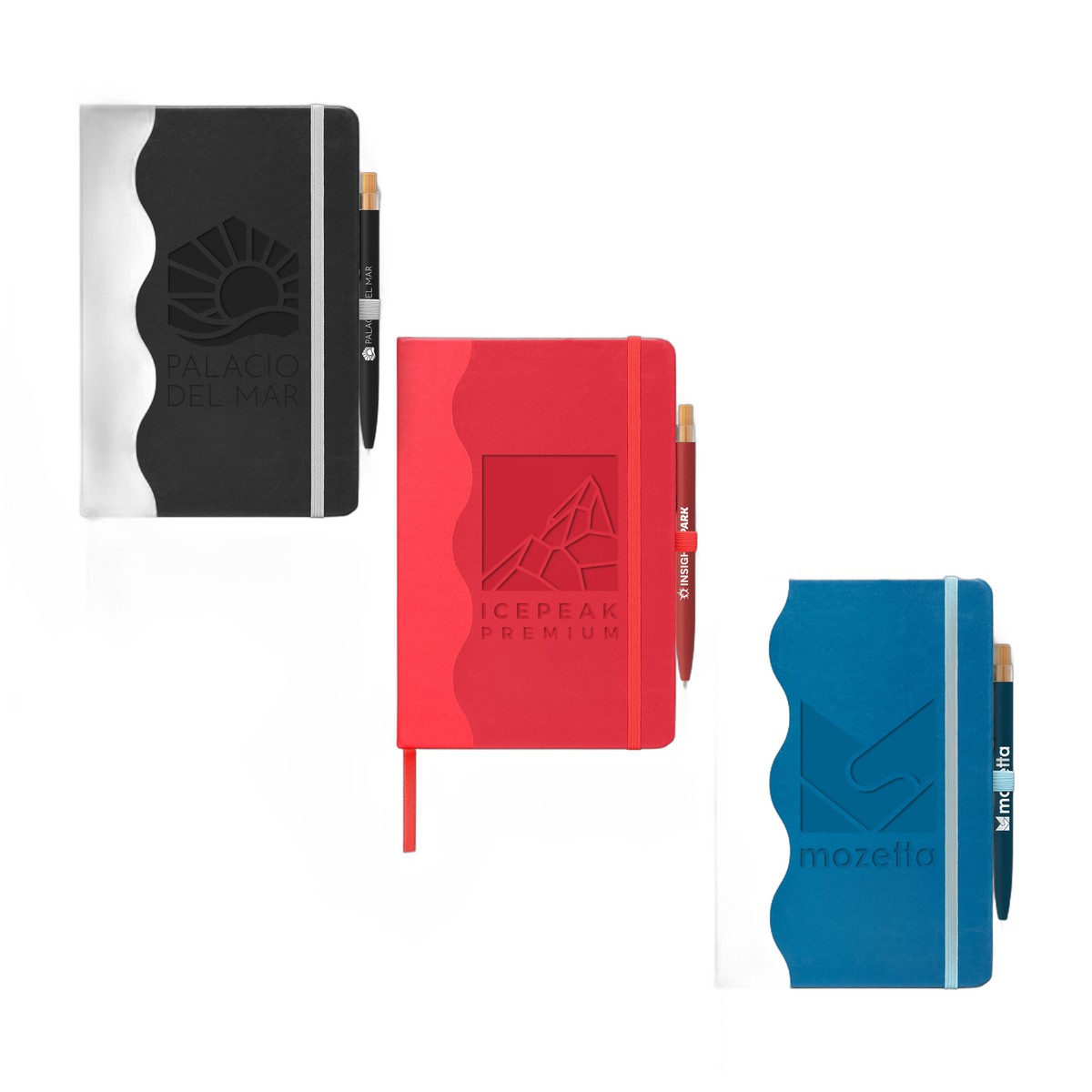 The Grete Journal & Pen Set is a complete, upscale package for sophisticated note-taking. The cover is made from PU (polyurethane) with 33% post-consumer recycled content, featuring a sleek and eye-catching printed wave pattern accent that runs across the spine and covers. The premium design continues inside with a matching two-tone wave pattern printed on the interior covers. For convenience, the journal is case-bound and includes a color-matching elastic strap closure, an integrated elastic pen loop, and a satin ribbon bookmark. Paired with a matching MTR pen, the set includes 80 sheets of 70gsm FSC®-certified lined paper, ensuring the Grete journal set is a stylish and ready-to-use executive accessory. 8.27" H x 5.71" W x 0.67" D