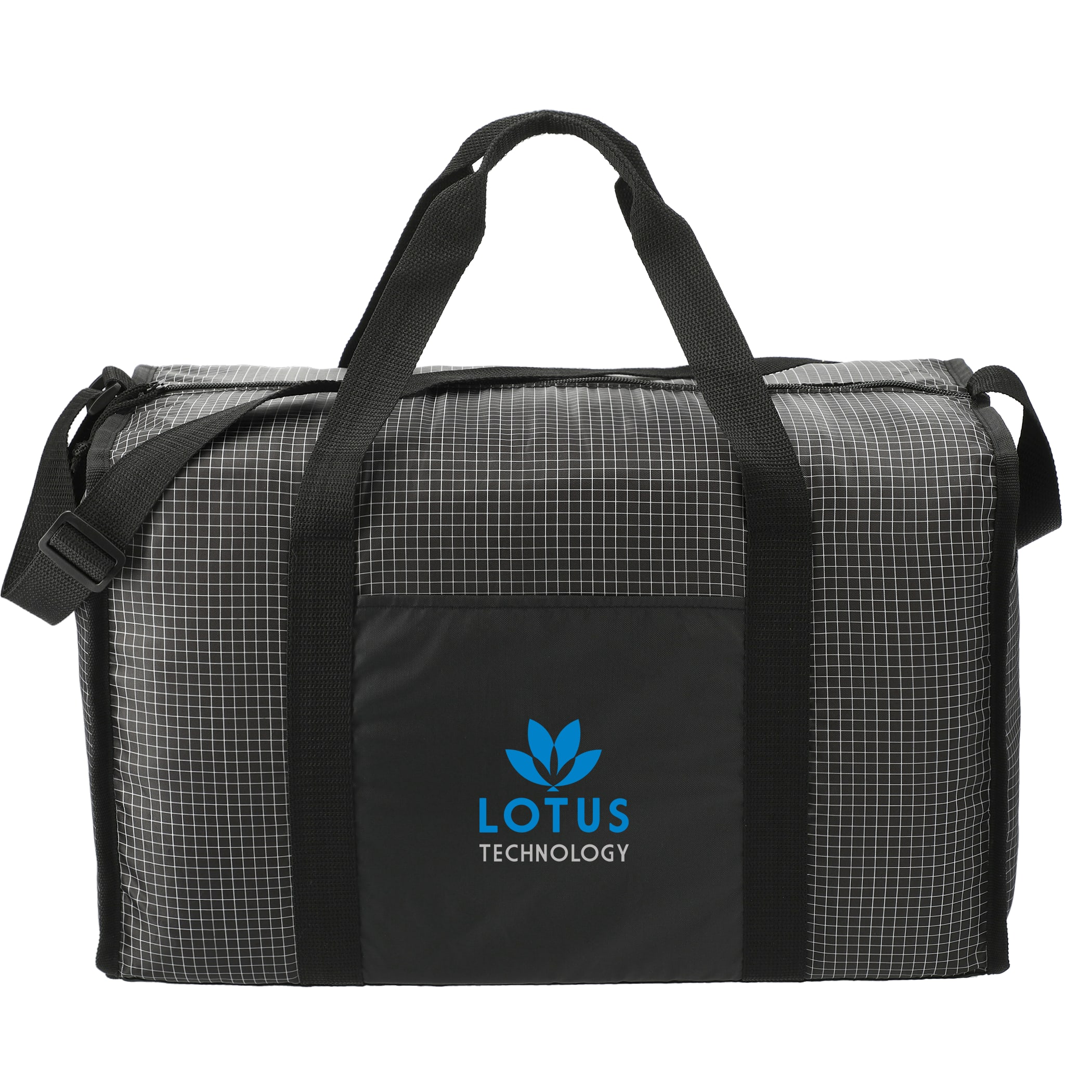 The Grid Boxy Duffel features a roomy zippered main compartment, two carry handles, and an adjustable shoulder strap. 10.50" D x 12.00" W x 18.00" H